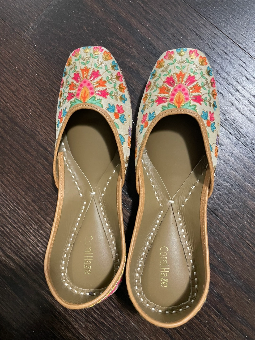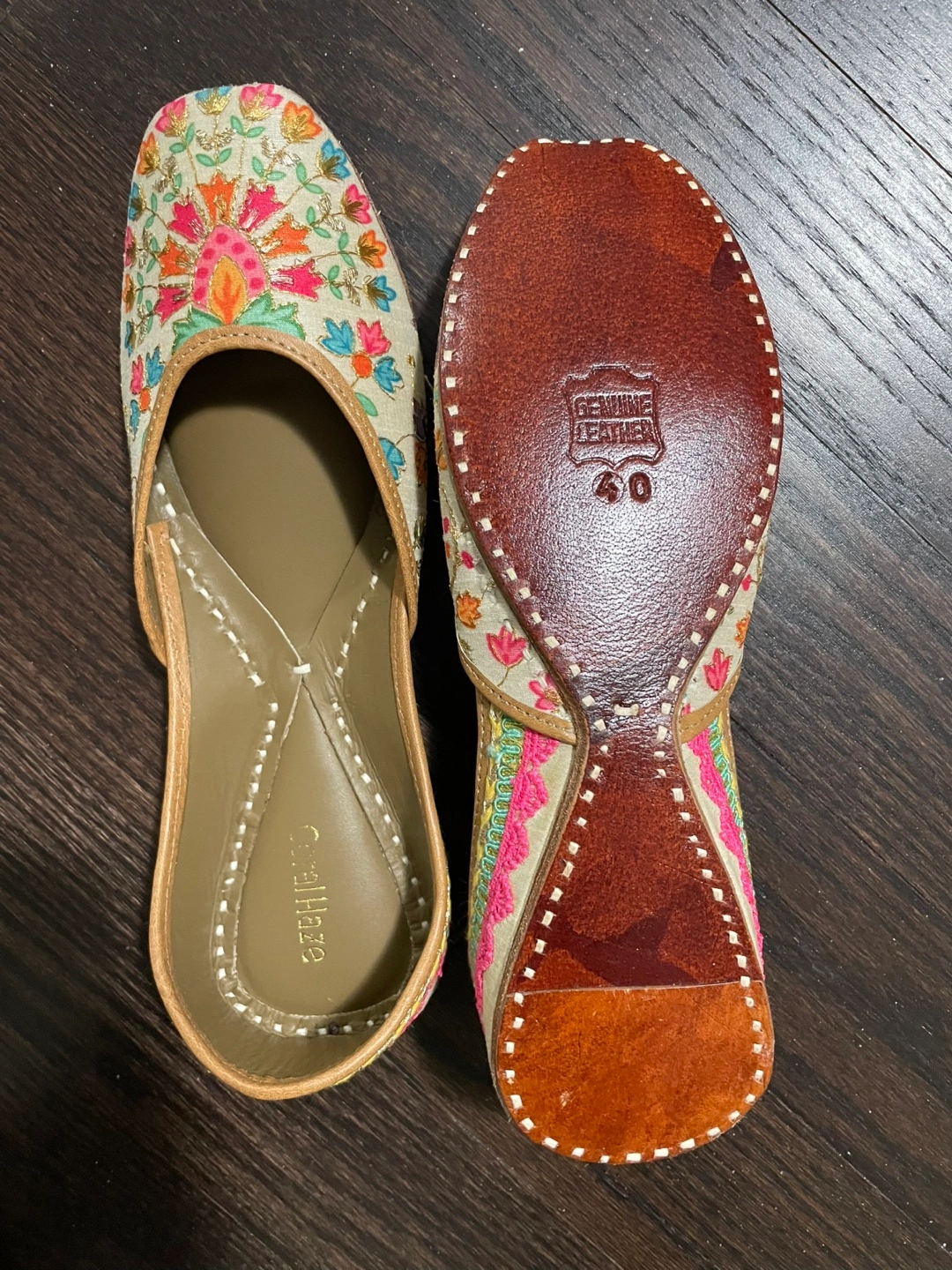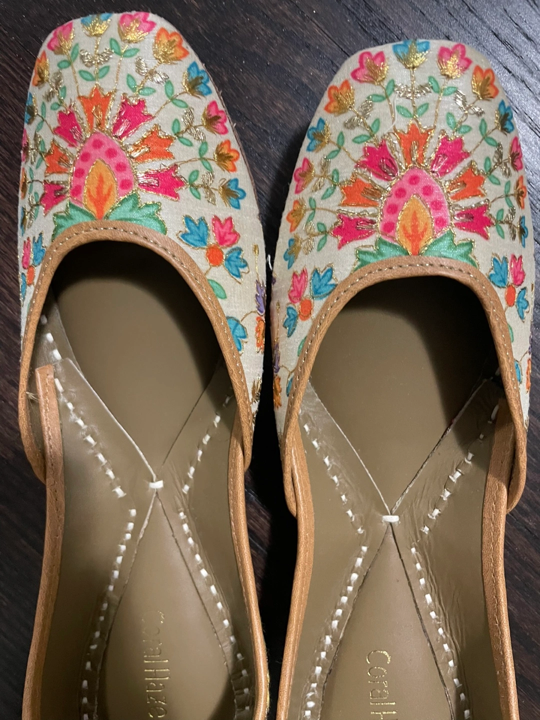Beautiful embroidered flat shoes with a square toe. The fabric is a cream colour with floral embroidery in various colours, including pink, blue, green and orange. The shoes have a brown leather sole and a small heel.