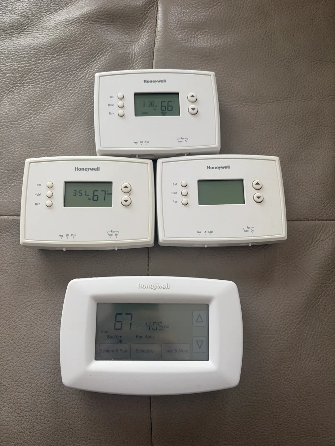 Includes three Honeywell digital thermostats. One larger, modern Honeywell thermostat with a color display. All are perfectly functional. Great for a home or office upgrade!