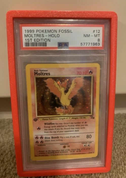 Selling a 1999 Pokemon Fossil Moltres Holo 1st Edition card, graded NM-MT 8 by PSA. A great addition to any collection!