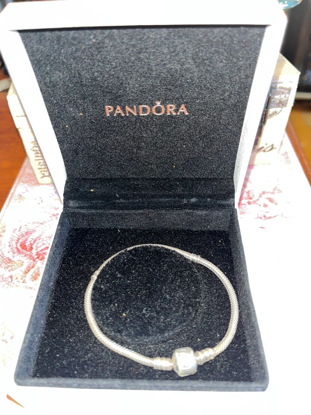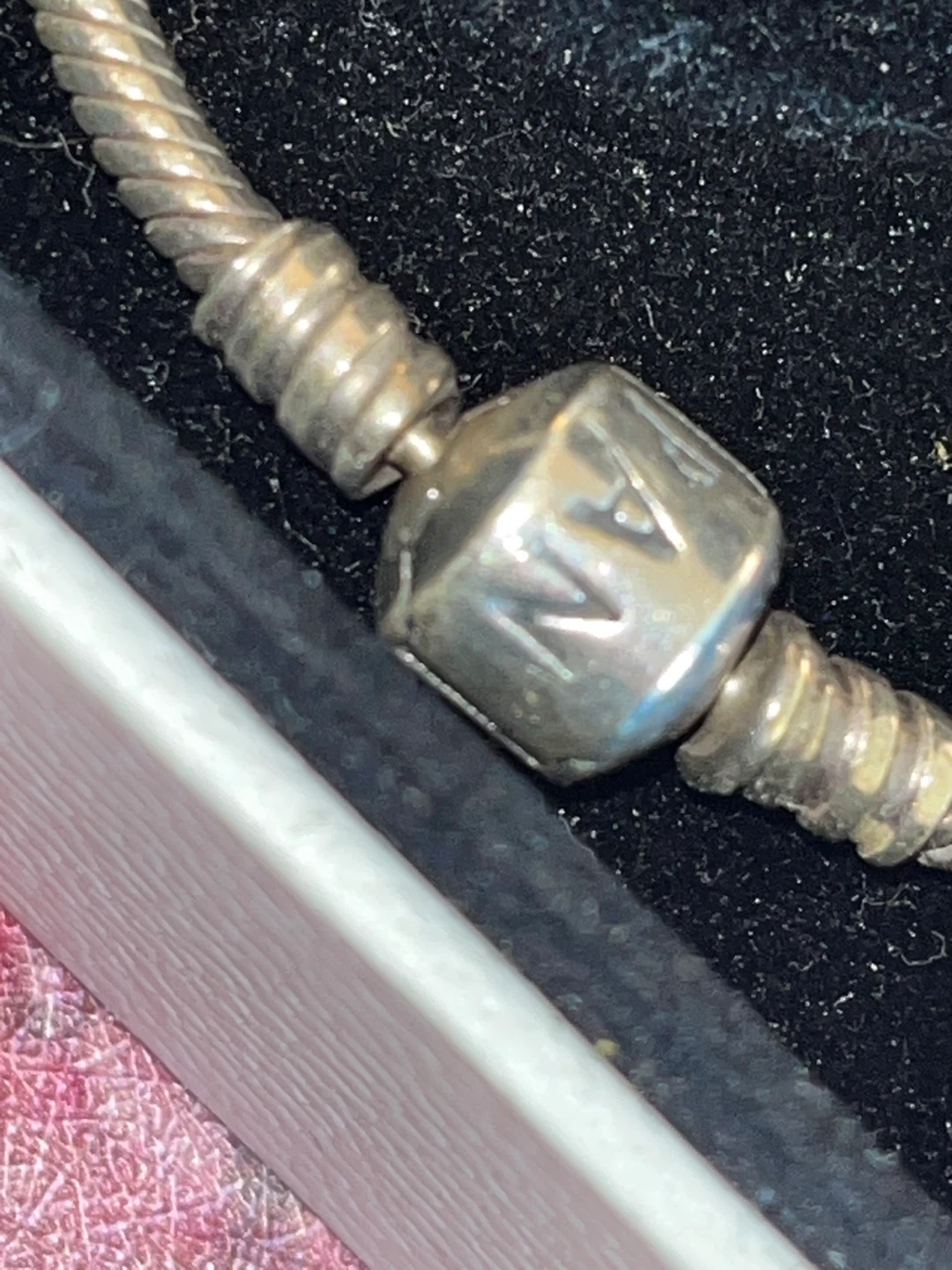 Pandora sterling silver snake chain charm bracelet with a safety clasp. Bracelet measures approximately 7 inches in length. Includes Pandora box.