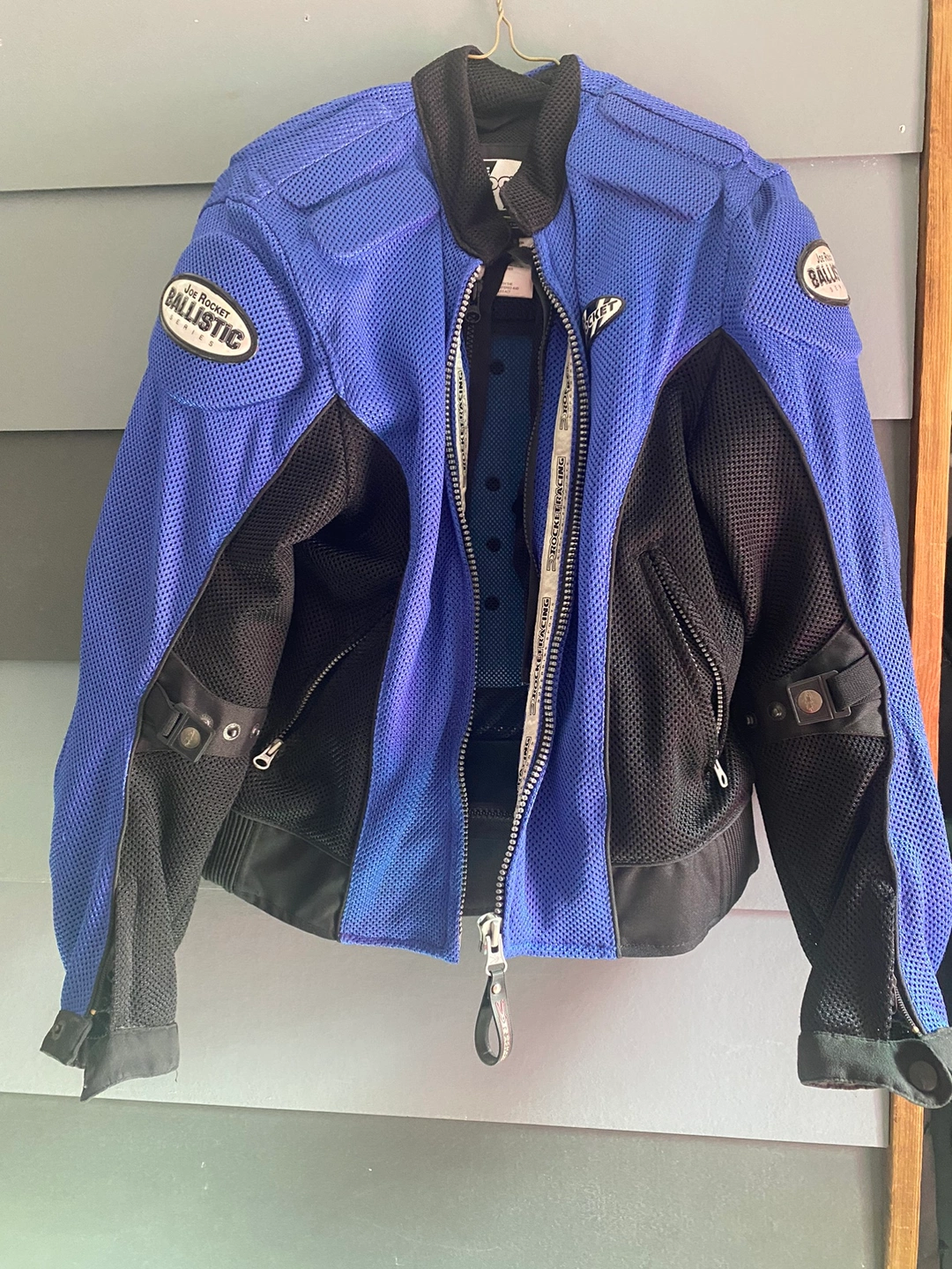 Blue and black Joe rocket motorcycle jacket with armour. It features a mesh design for ventilation and has a zipper closure. It has a removable liner and pockets. It is in good condition.