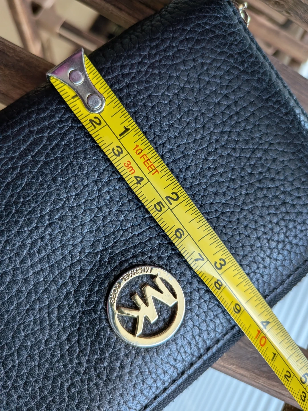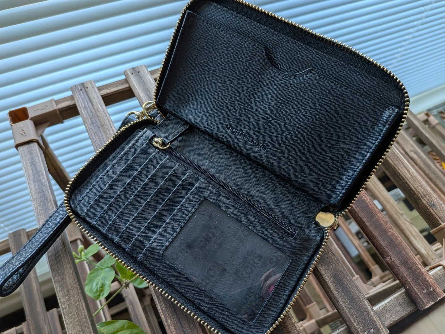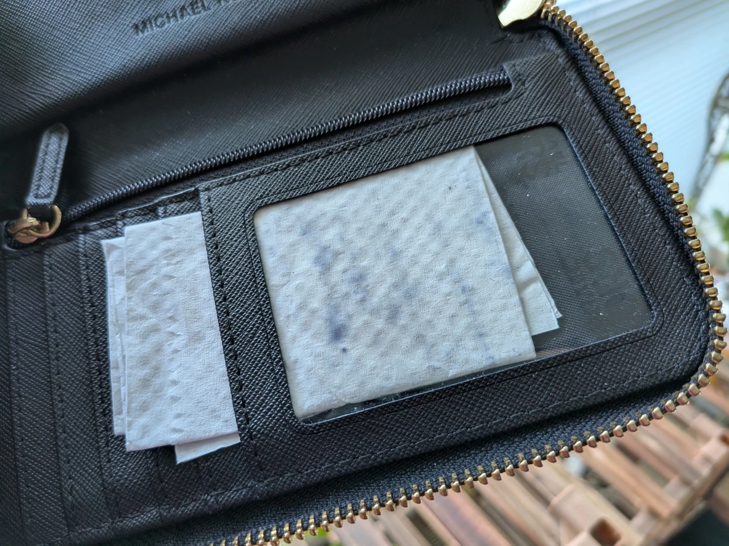 Selling my black, pebbled leather Michael Kors wristlet wallet. Love the zip-around closure, wrist strap and slots for multiple card but just don't use it as much as it deserves. So time to let it go. It's a convenient way to carry your essentials on-the-go. While it's like-new with no cosmetic or structural concerns on the outside (there's a minor discoloration on the back left bottom - see photos), and also no rips or scratches inside, do note the ID window on the inside is stained, likely from receipts or business card (?) - see photo. I haven't tried removing the stain so it could be an easy fix if you know what to do.