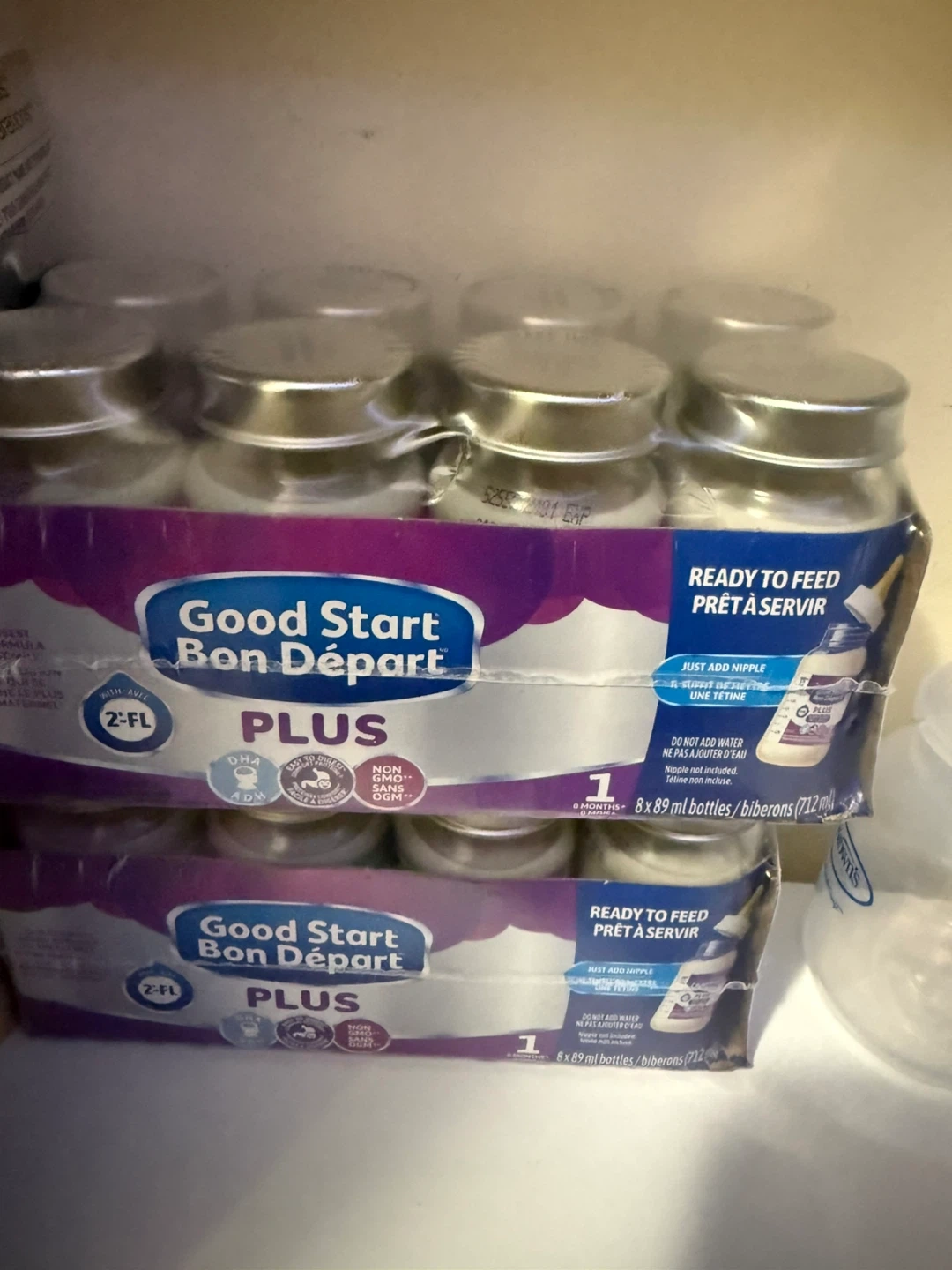 Good Start Bon Départ PLUS ready-to-feed formula. Each bottle is 89ml, and this pack contains 8 bottles for a total of 712ml. It's suitable for babies from 0 months. $25 each or $40 for two.