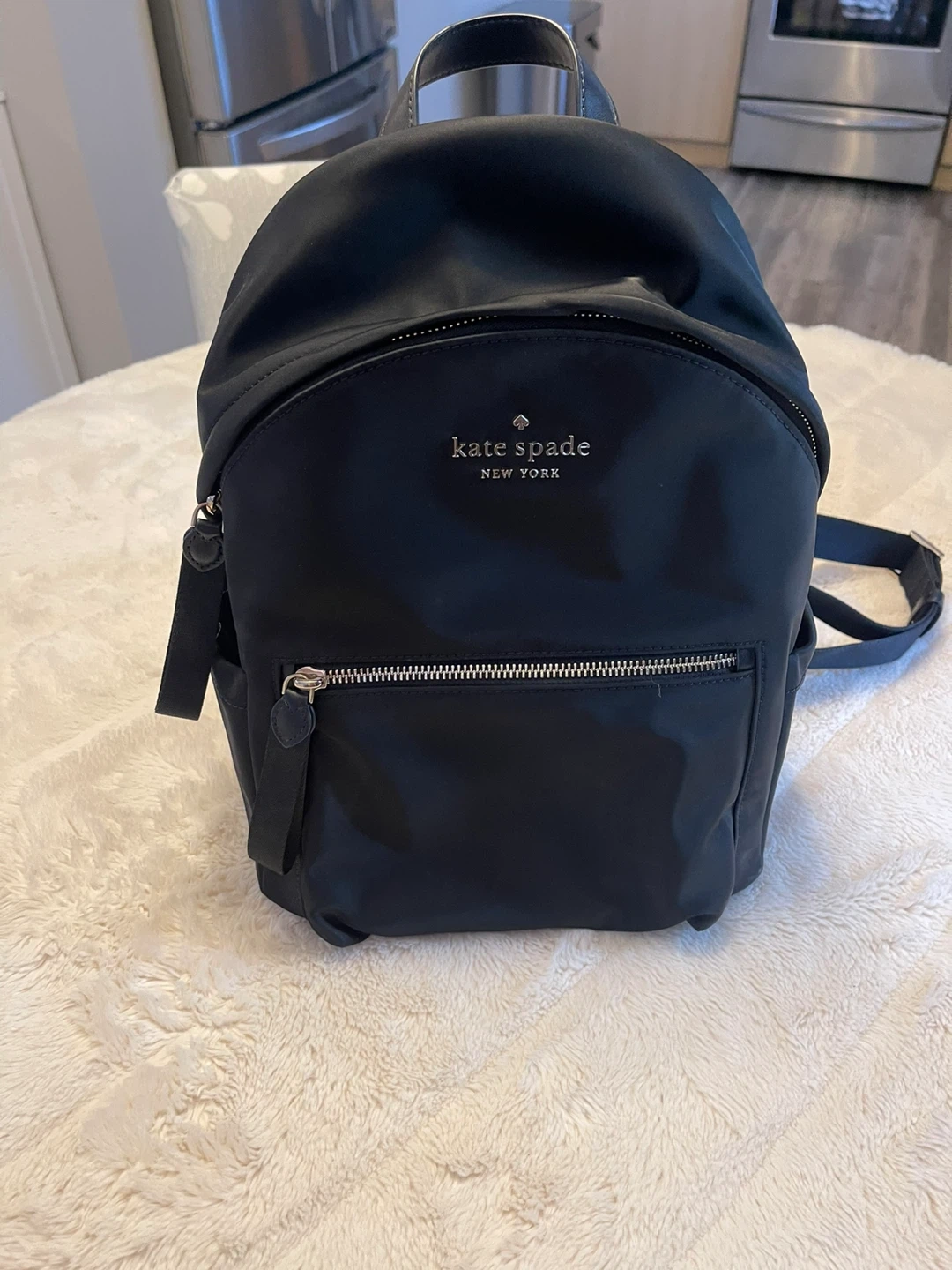 This is a black nylon backpack from Kate Spade New York. It has adjustable shoulder straps and multiple pockets for organization. It's a versatile accessory for everyday use! 10 inch long x 6 inch wide x 13 inch high.