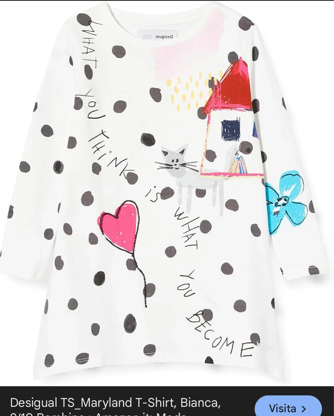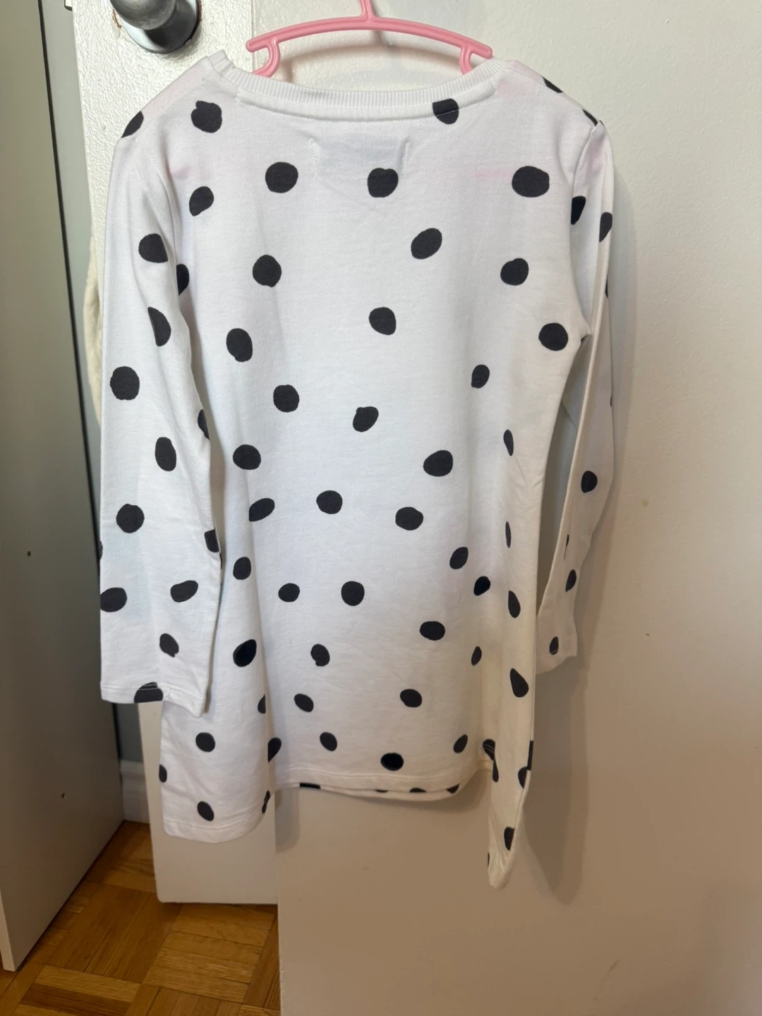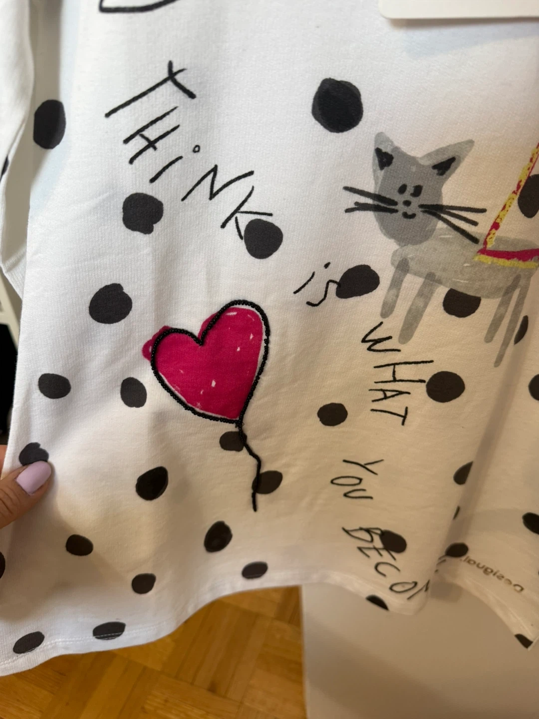 This Desigual long sleeve shirt is white with black polka dots and a graphic print featuring a cat and house. It's made of cotton and is size 3/4 (98-104 cm).