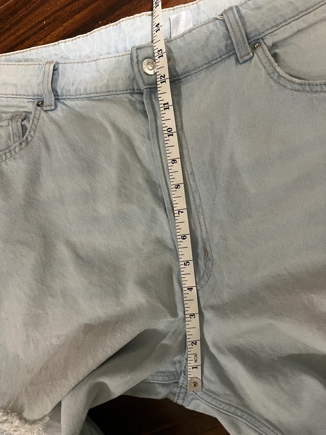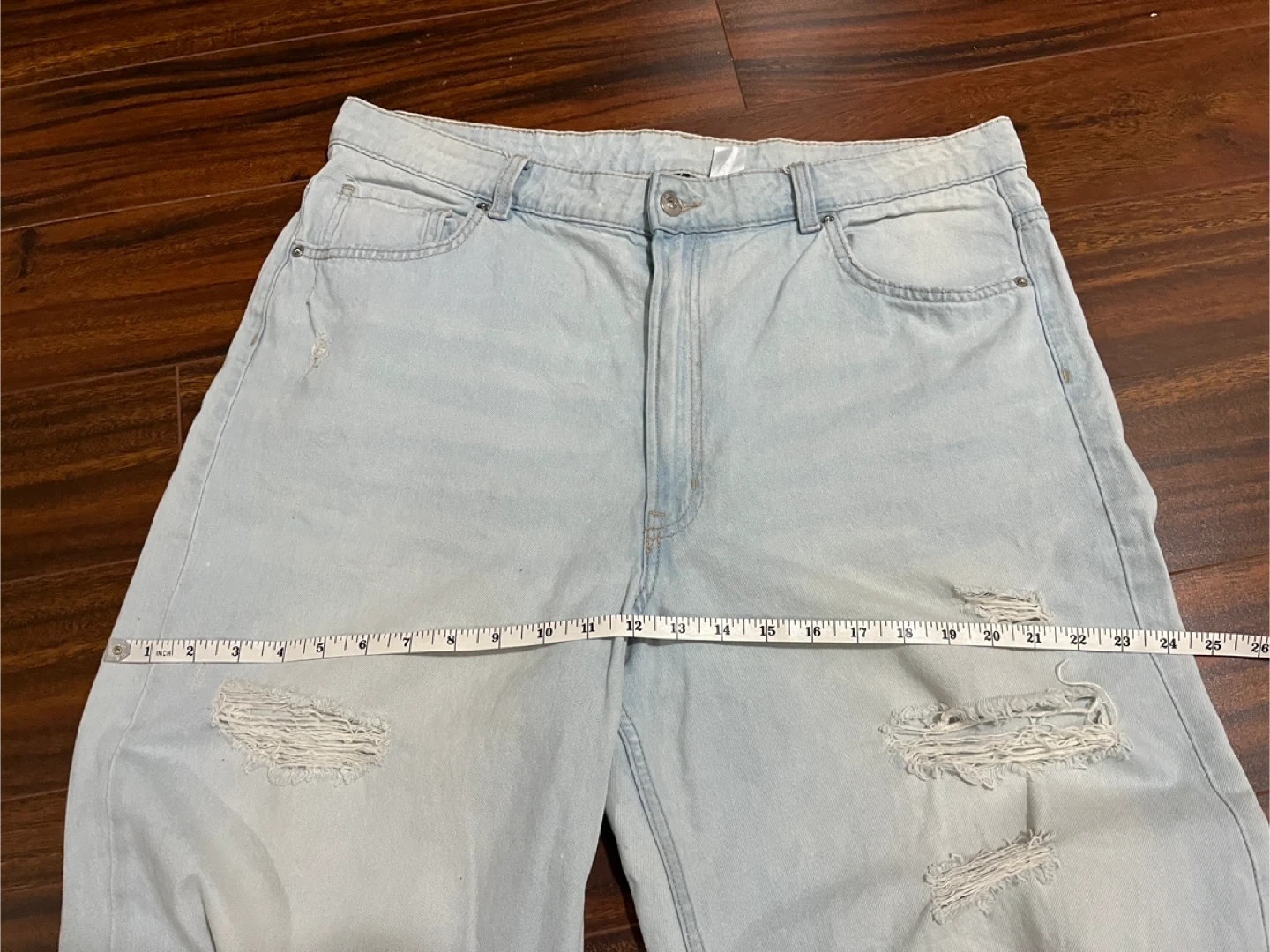 H&M Divided women’s 16 relaxed wide leg jeans in light wash. High rise 100% cotton denim with intentional distressed rips on the front thighs.