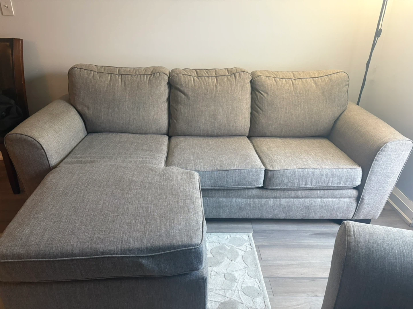 Comfortable three-seater sectional sofa with a chaise lounge in a neutral grey fabric. It's upholstered and has clean lines with piped edges. The chaise can be positioned on either side. This sofa would be great for a living room or family room!