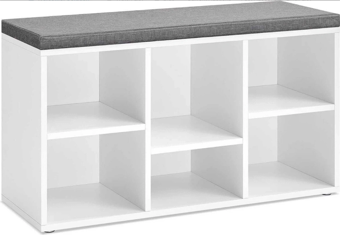 This white storage bench features a grey upholstered cushion top. It has six cube-shaped compartments for organization. The maximum static load capacity is 300 lb (136 kg).