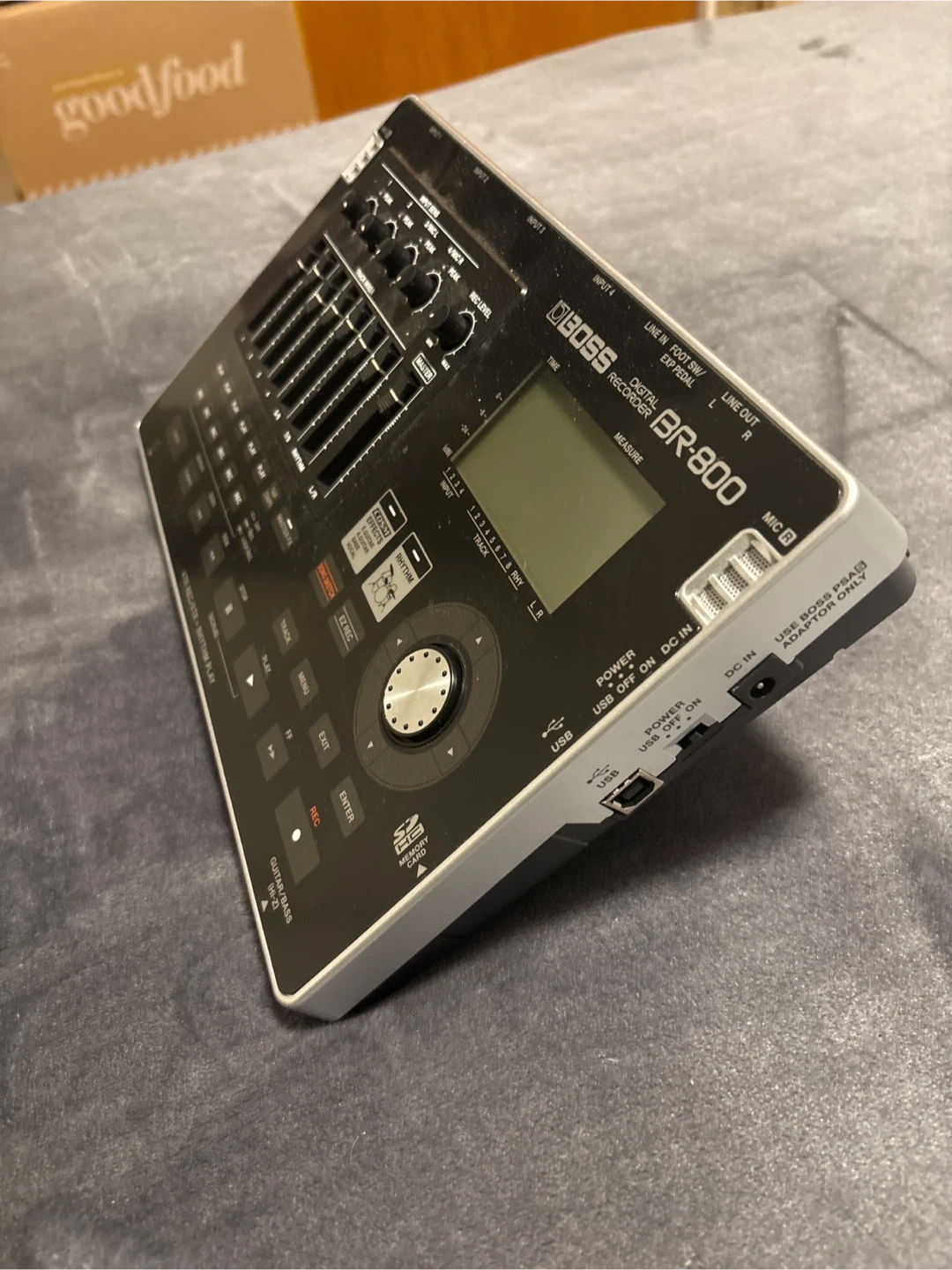 BOSS BR-800 digital recorder. It's a 4-track recorder with rhythm play. Includes inputs for guitar/bass, mic, and line.