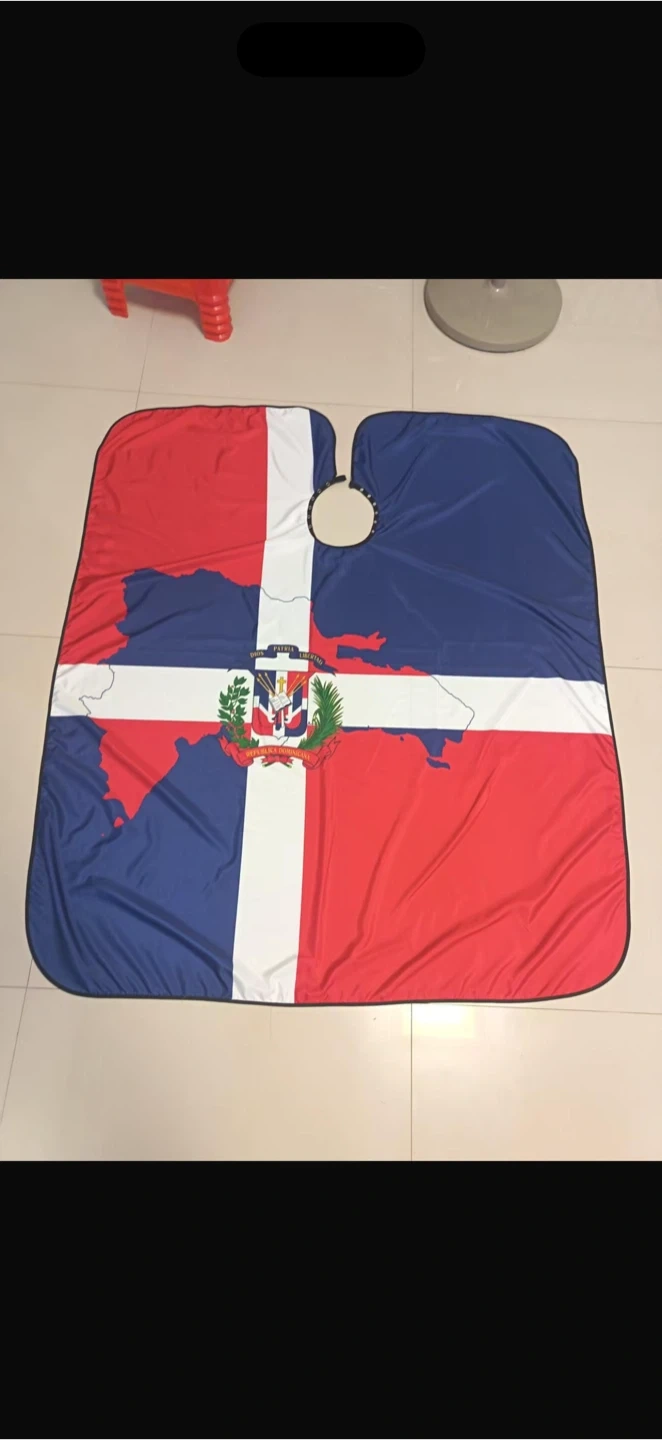This cape features the Dominican Republic flag design. It has a neck opening for use during haircuts. Durable material for salon or home use.