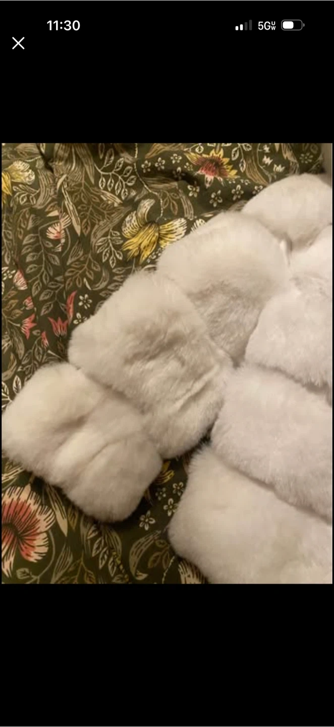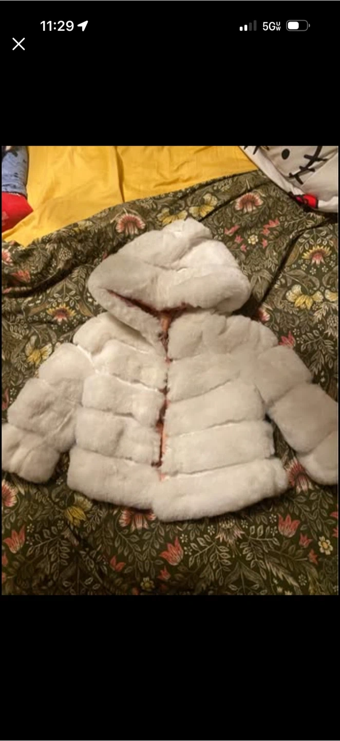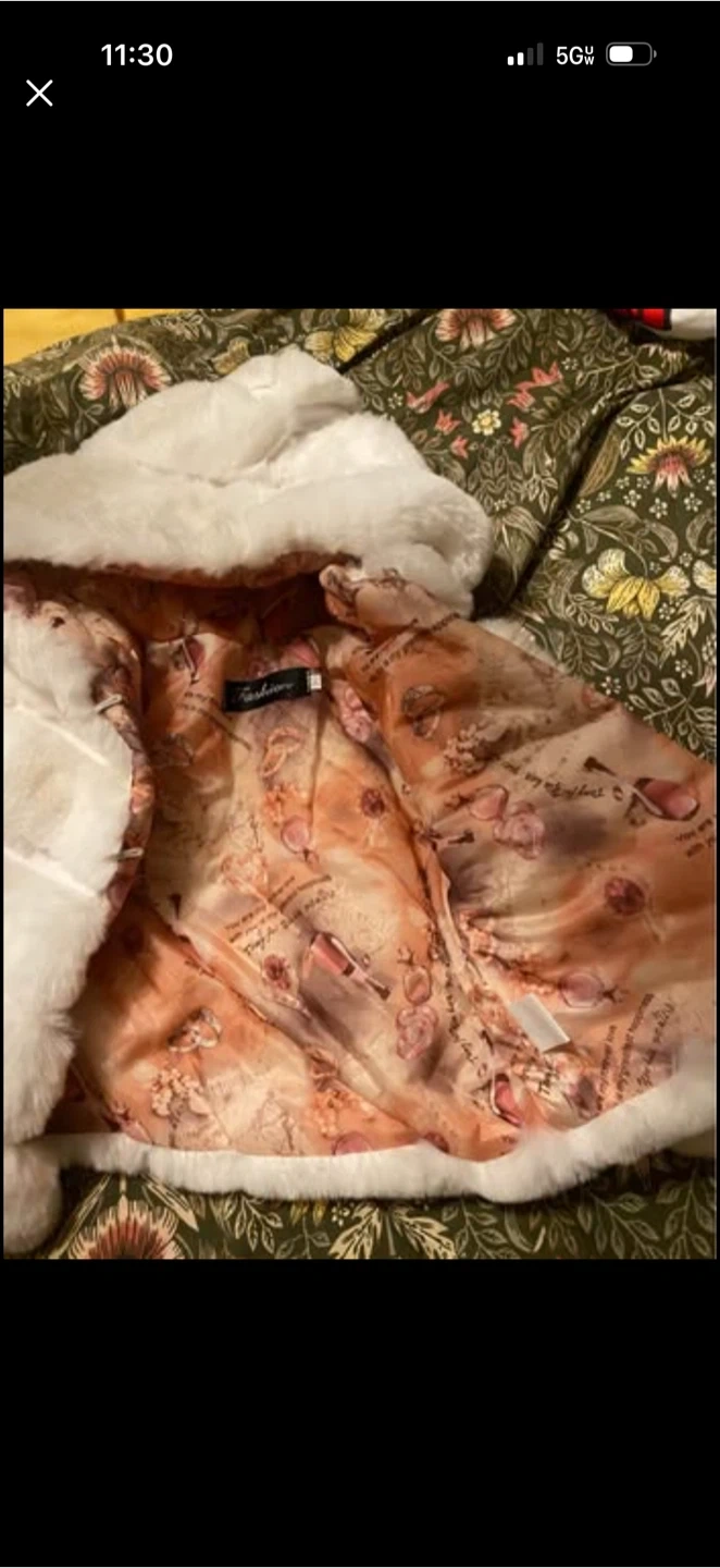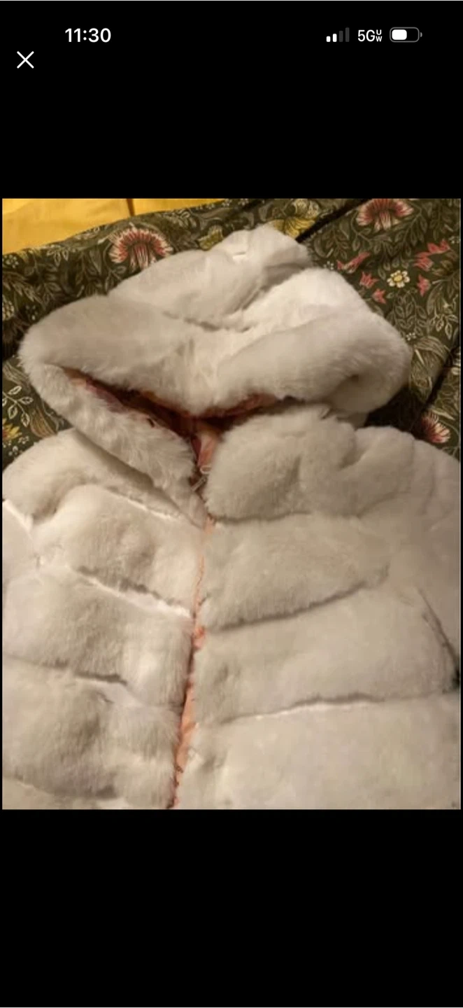 This cozy white faux fur jacket has a unique pink patterned lining. It features a hood for extra warmth. A stylish outerwear piece for cooler days!