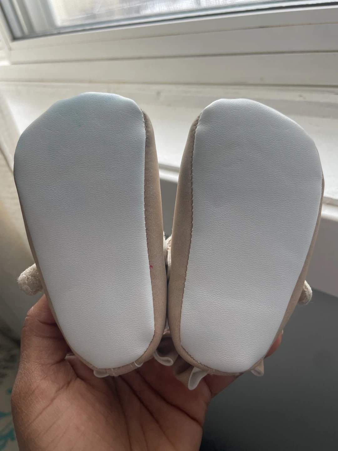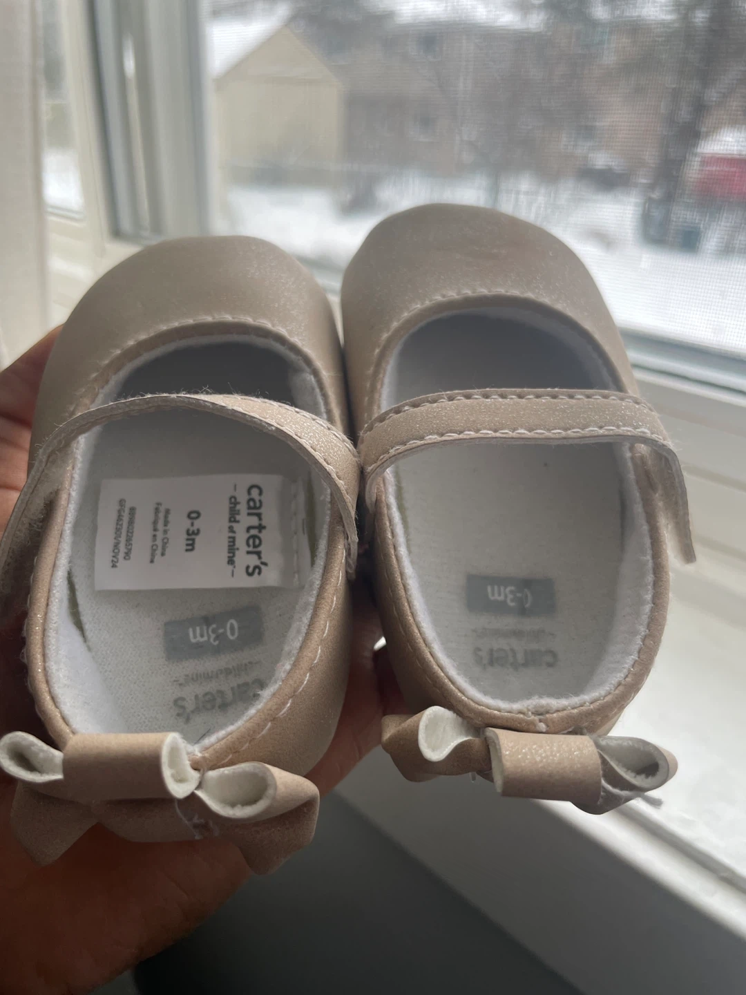 These adorable Carter's baby shoes are a size 0-3 months. They're a lovely neutral champagne colour with cute little bows on the back. Perfect for a newborn's first special occasion!