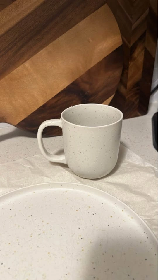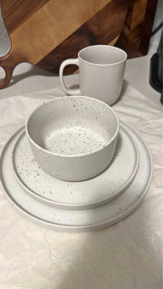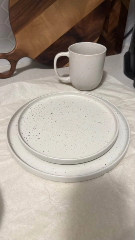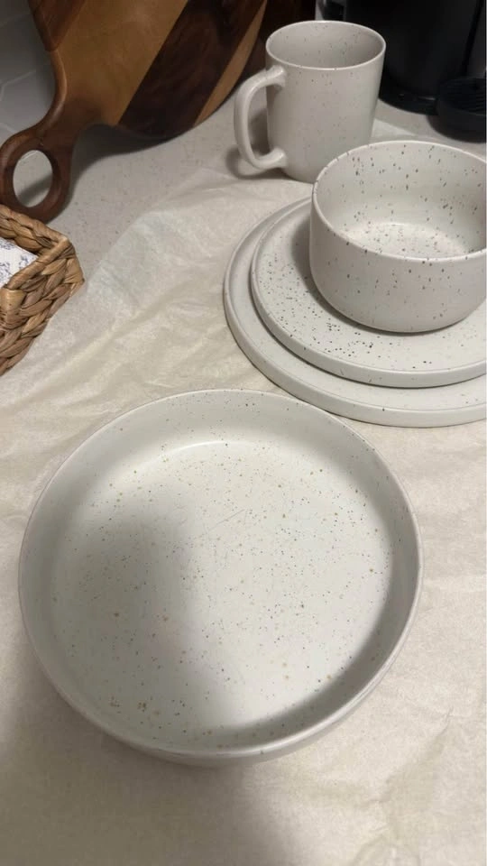 Stoneware. Set of 8 place settings. Paid over $600 for this entire set. Selling for $320 obo. 8 Small Bowl: 5.75"W x 5.75"D x 3"H. 8 Large Bowl: 8"W x 8"D x 2"H. 8 Side Plate: 8.50"W x 8.50"D x 0.75"H. 8 Dinner Plate: 10.75"W x 10.75"D x 0.75"H. 8 Mugs: 21 oz.