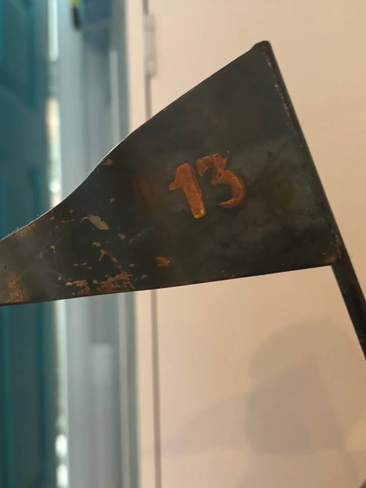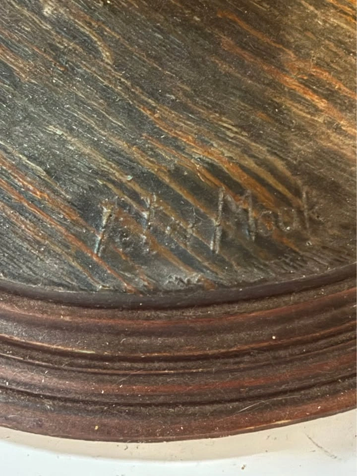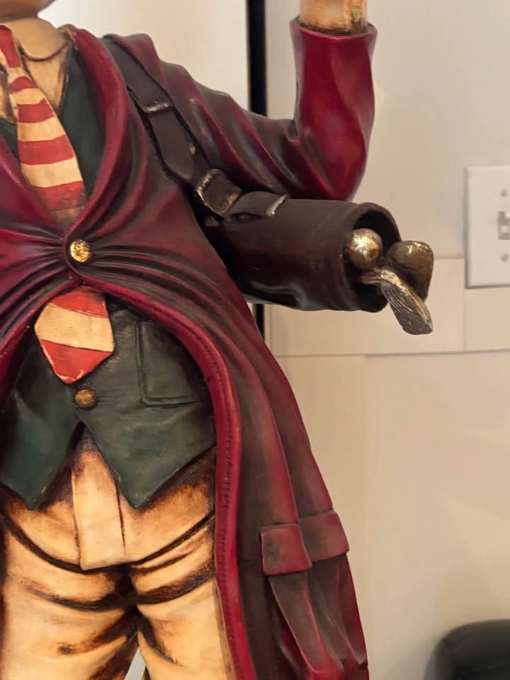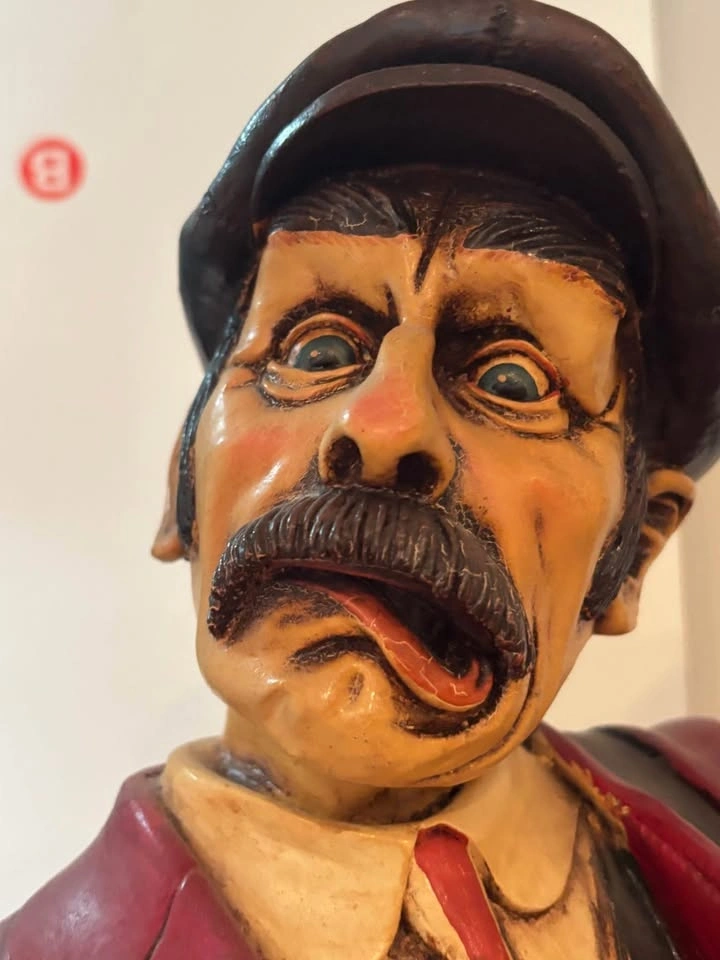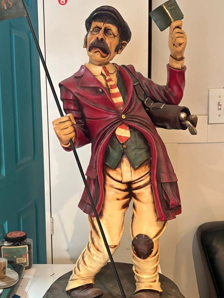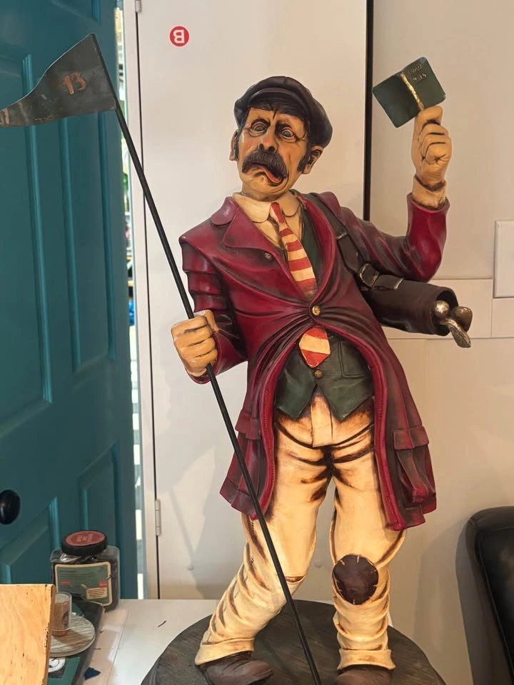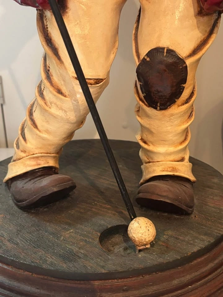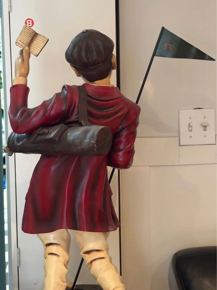Up for sale is this impressive, large-scale hand-painted golf caddy statue sculpted by renowned artist Peter Mook. Peter Mook is a world-renowned sculptor known for his highly detailed, whimsical, and character-filled resin sculptures featuring golfers, chefs, cartoon characters, and more. This particular piece is a standout — much larger than the common 14–27” versions commonly found. It captures a comical, frustrated/expressive caddy with wide bulging eyes, open mouth, and tongue sticking out — pure personality and golf humor! Details: Figure: Mustachioed caddy in a dark cap, red jacket (knotted at waist), striped tie, green vest, patched/knee-worn pants, and boots. Extremely detailed facial features, textured hair, and expressive pose. Accessories: Holds a tall flag pole with a dark green triangular flag marked “13” in gold. Other hand holds a green book titled “CADDY RULES” with gold lettering. Base: Heavy round dark wood base, signed “Peter Mook” (visible in photos). Size: Approximately 3+ feet tall (substantial presence — see photos next to door and light switch for scale). Material: Hand-sculpted and painted resin/composite with glossy finish and artistic distressing. Condition: Very good vintage/pre-owned condition. Shows expected paint crazing, wear, and patina that adds to its character. No major breaks, cracks, or repairs. Flag and book are firmly attached. Very display-ready! This rare large Peter Mook golf sculpture would be a fantastic addition to a golf room, man cave, clubhouse, bar, or collection of golf memorabilia/folk art. It’s a real conversation piece and stands out beautifully! Local pickup strongly preferred in Richmond Hill, Ontario area. Message me with any questions or for additional photos/measurements.
