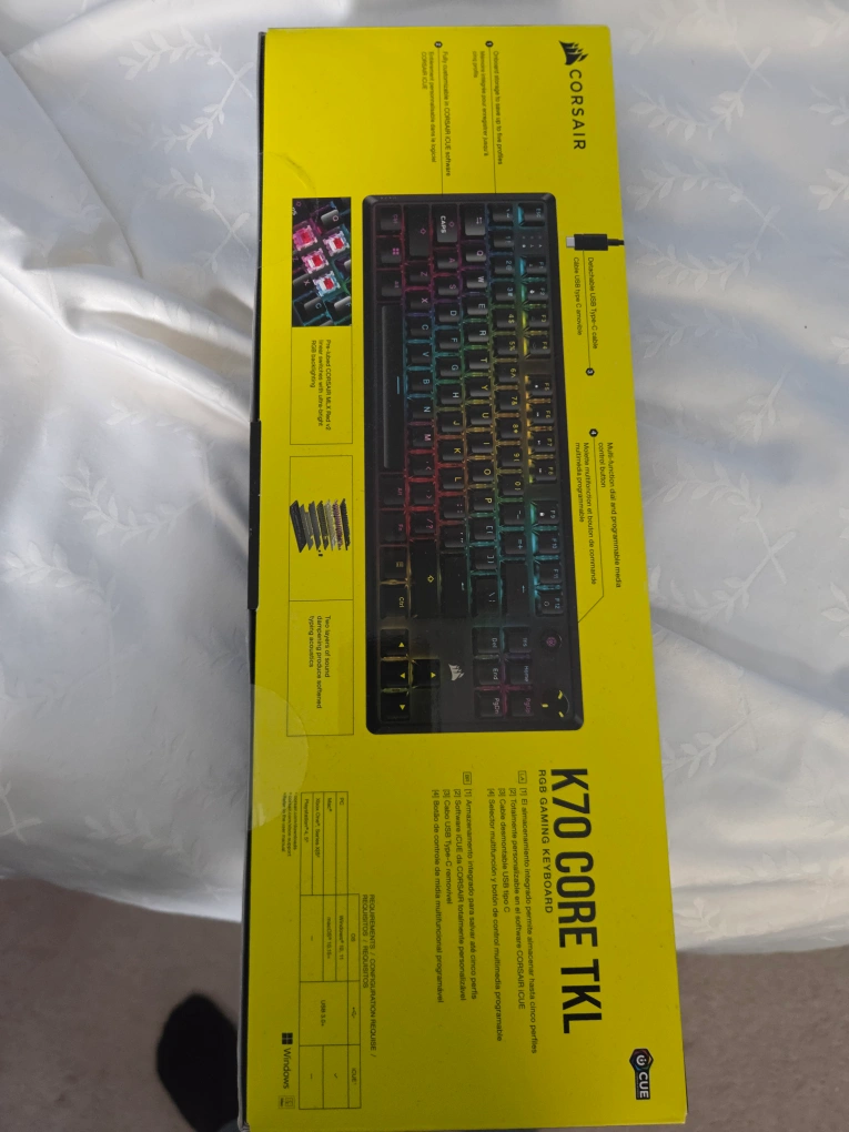 This is a Corsair K70 Core TKL RGB Gaming Keyboard. It features onboard storage for up to five profiles and a detachable USB Type-C cable. It also has a multi-function dial and programmable media control button.