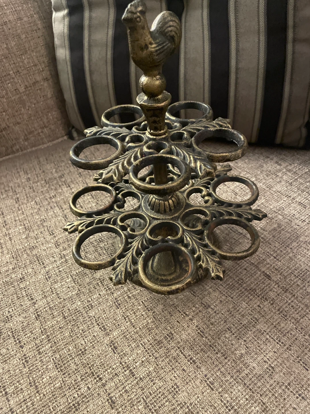 This decorative stand holds up to 12 eggs with a charming rooster top. It's made of a metal material with an antique brass finish. This piece is great for displaying eggs in your kitchen or for use as a unique Easter decoration!