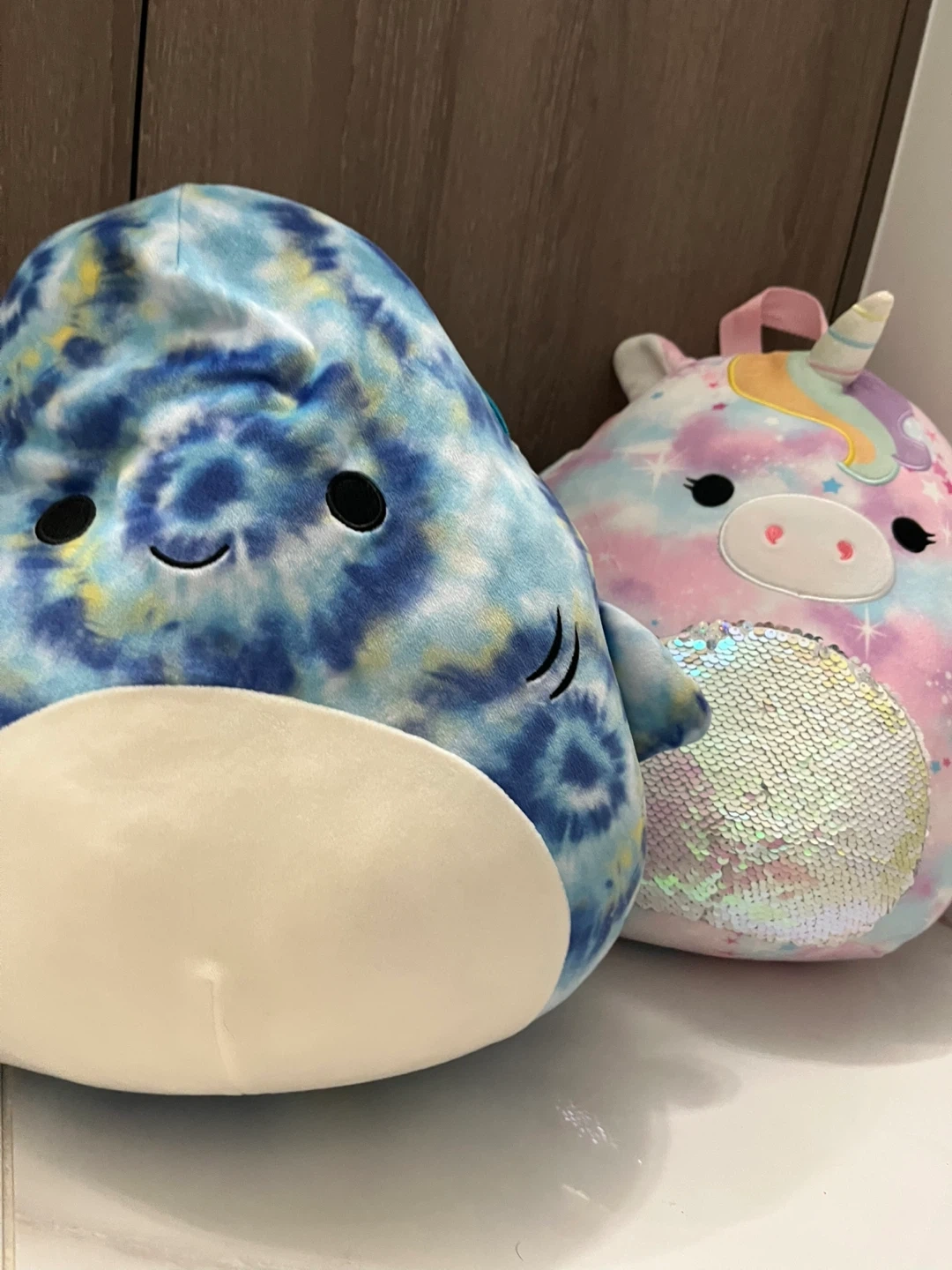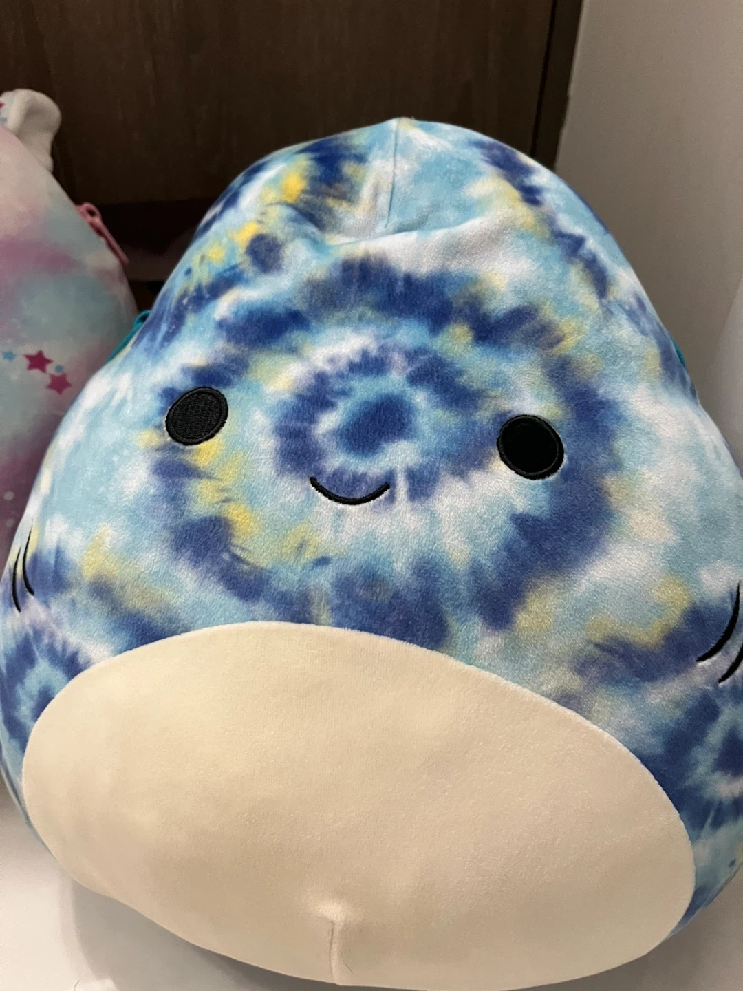 This Squishmallows backpack features a fun tie-dye shark design. It's made from soft plush material and has adjustable straps. It's perfect for carrying small essentials.