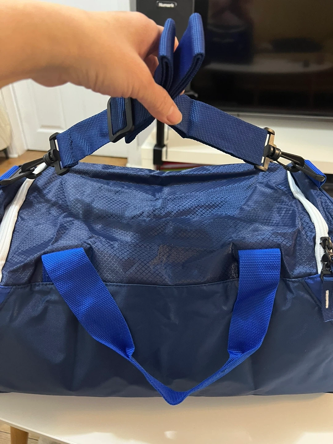 Its not a branded one but I haven’t use it, Its basically new. A versatile blue duffel bag with a zippered front pocket and mesh side pocket. It has dual handles and an adjustable shoulder strap.