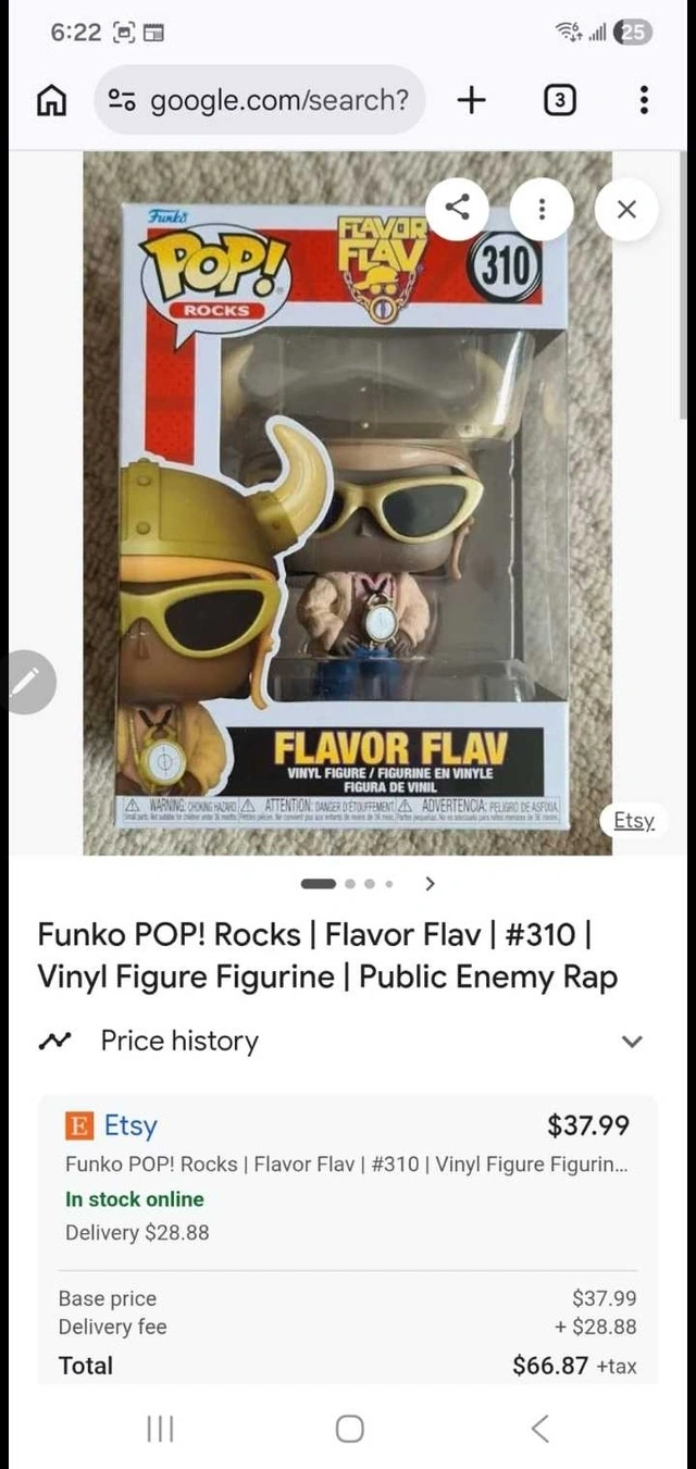 Offering a brand new Funko POP! Rocks Flavor Flav #310 vinyl figure. This collectable figurine features Flavor Flav, complete with his iconic Viking helmet and clock necklace. It's in good condition with minor wear. Figure Number: 310, Character: Flavor Flav, From: Public Enemy Rap Group. Similar Funko POP! figures are priced around $70 CAD. If the ad is still up, the Funko POP! is available.