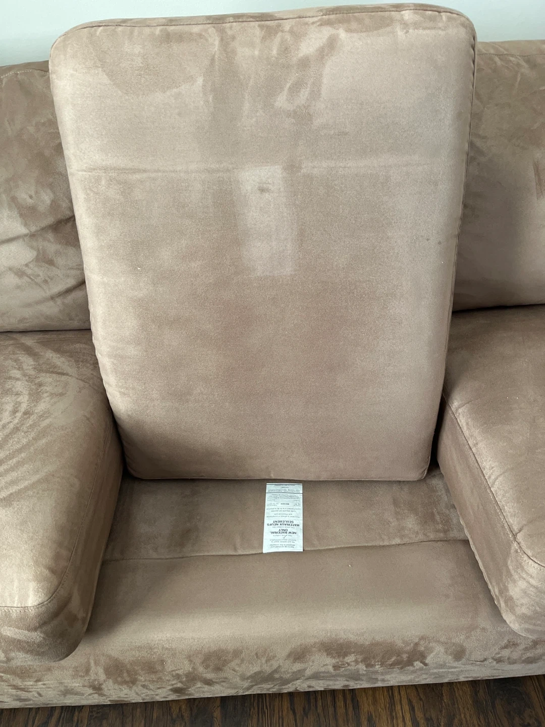 Comfortable 3-seater sofa with plush cushions. Upholstered in a soft tan suede-like fabric. Spacious seating for multiple people.