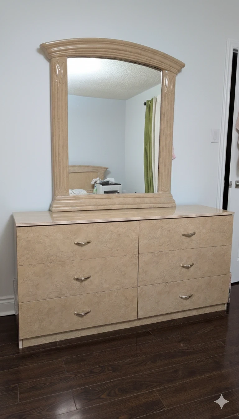 A light beige bedroom dresser with six drawers and an attached arch mirror. The dresser has decorative hardware on each drawer. This set would be suitable for a master bedroom or guest room. It's a classic style that adds elegance to any space.