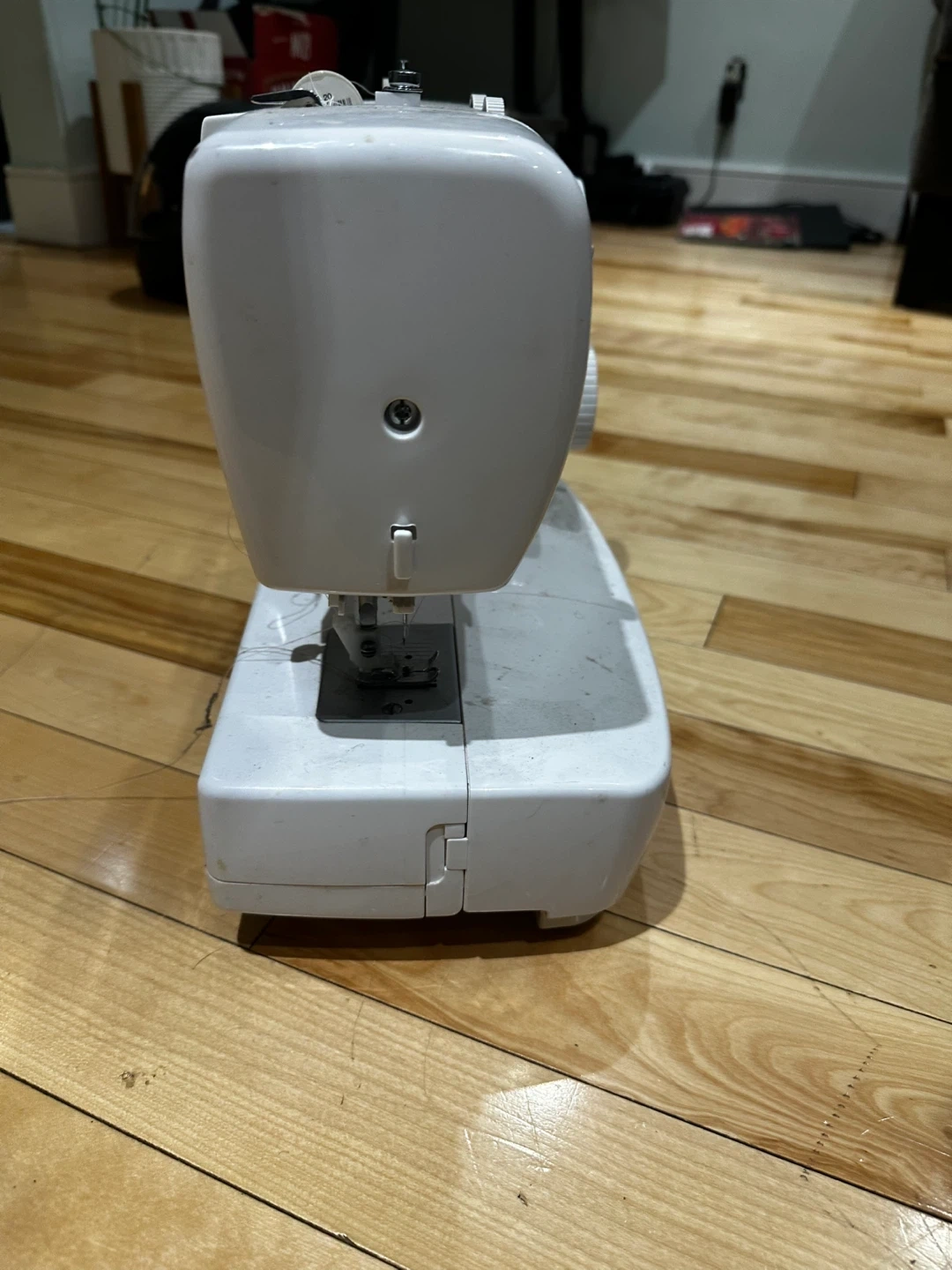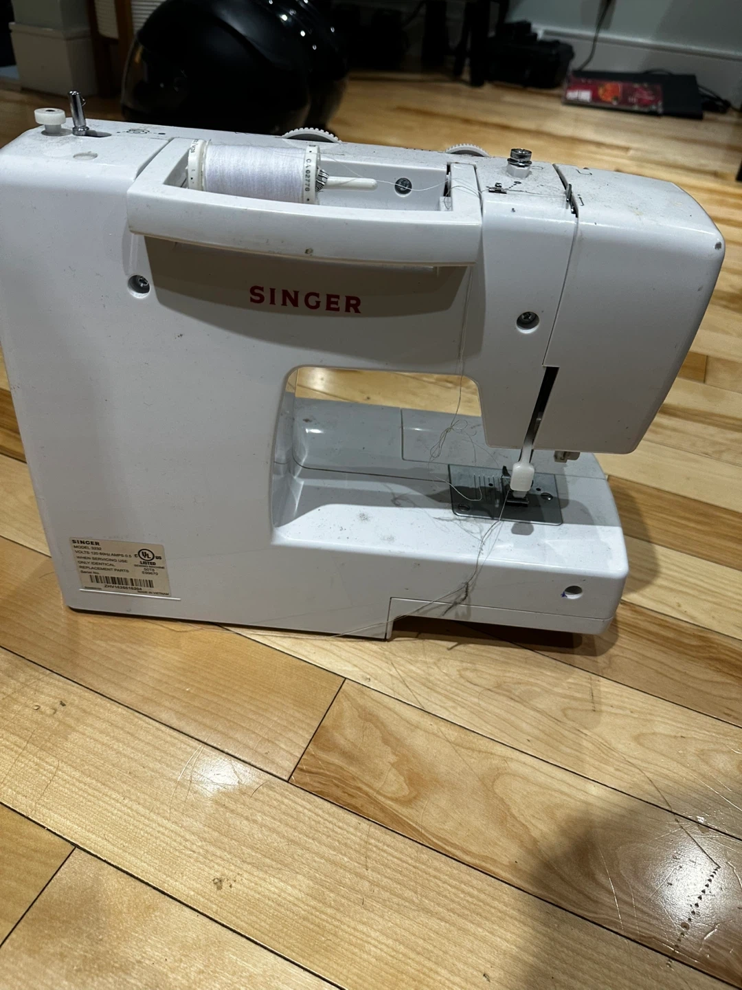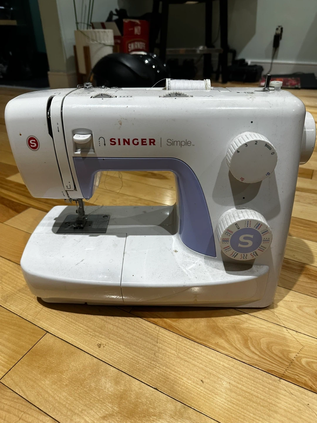 White Singer Simple sewing machine. This is a compact and easy-to-use sewing machine. It's suitable for basic sewing tasks and beginners.