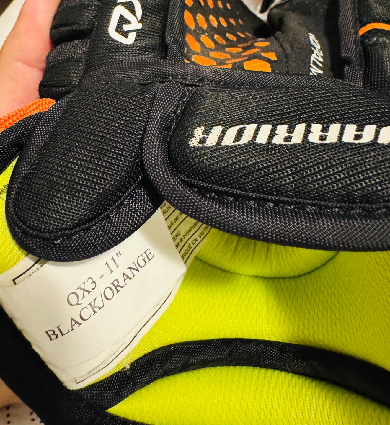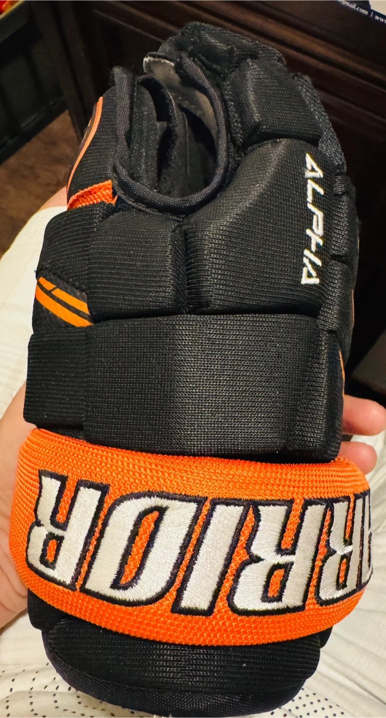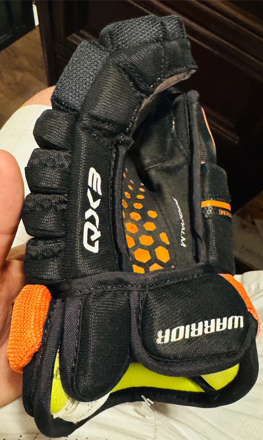 Warrior Alpha QX3 hockey gloves in black and orange. Size 11". These gloves offer good protection and mobility for the game. Made with a durable construction.