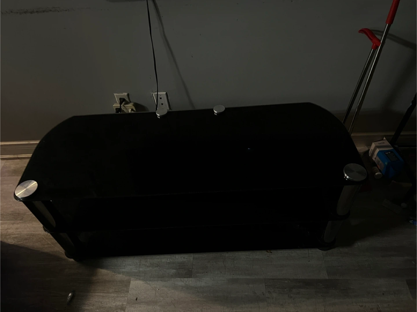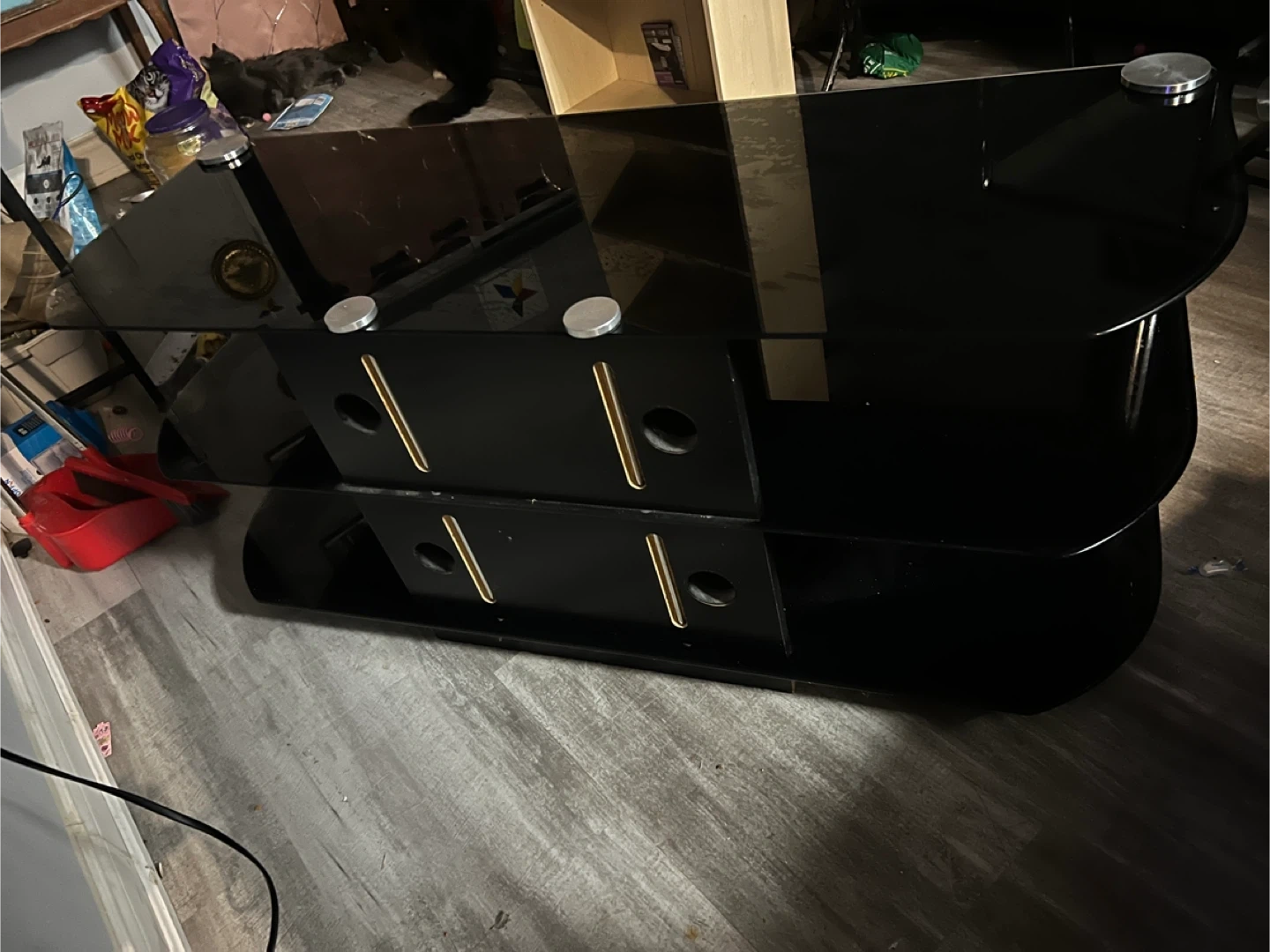 This is a three-tiered black glass TV stand with chrome accents. It's suitable for holding your TV and media devices. The tempered glass shelves offer ample storage space. It is in excellent condition! Very modern look. And super durable and strong!