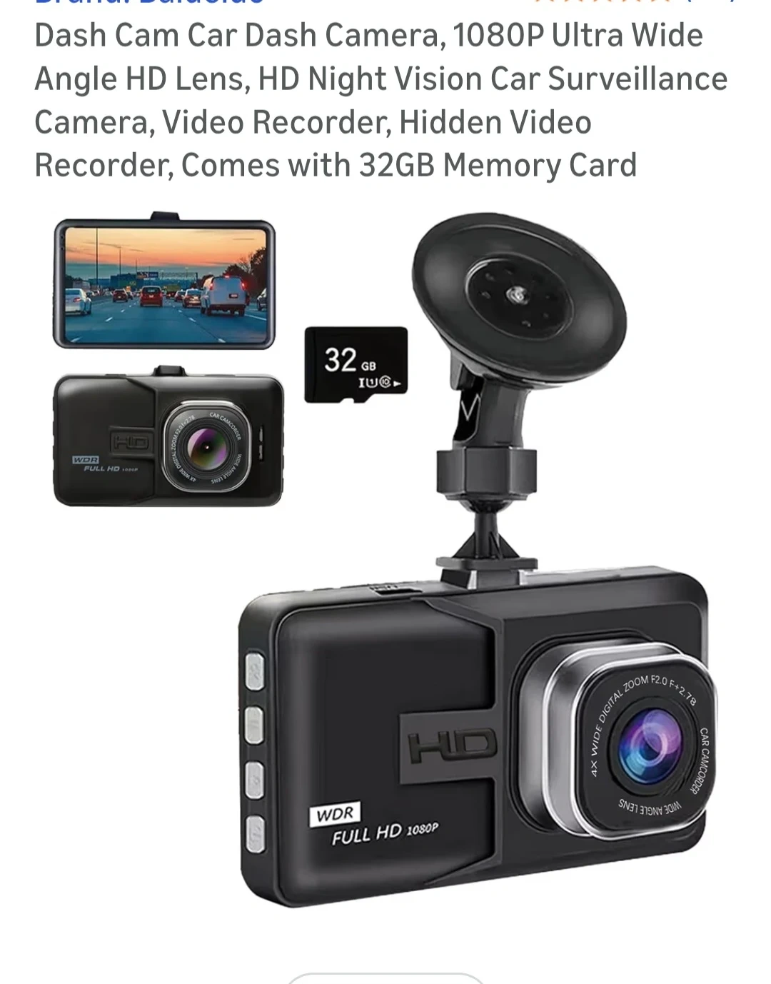 Selling a dash cam car camera that records in 1080P. It has an ultra-wide-angle HD lens and HD night vision for car surveillance. It also comes with a 32GB memory card and is a video recorder with a hidden video recorder function