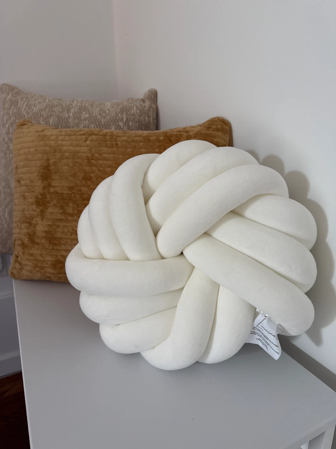 A soft, white throw pillow with a unique knotted ball design. Its plush material makes it comfy for lounging. It's a neat accent piece for any sofa or chair!