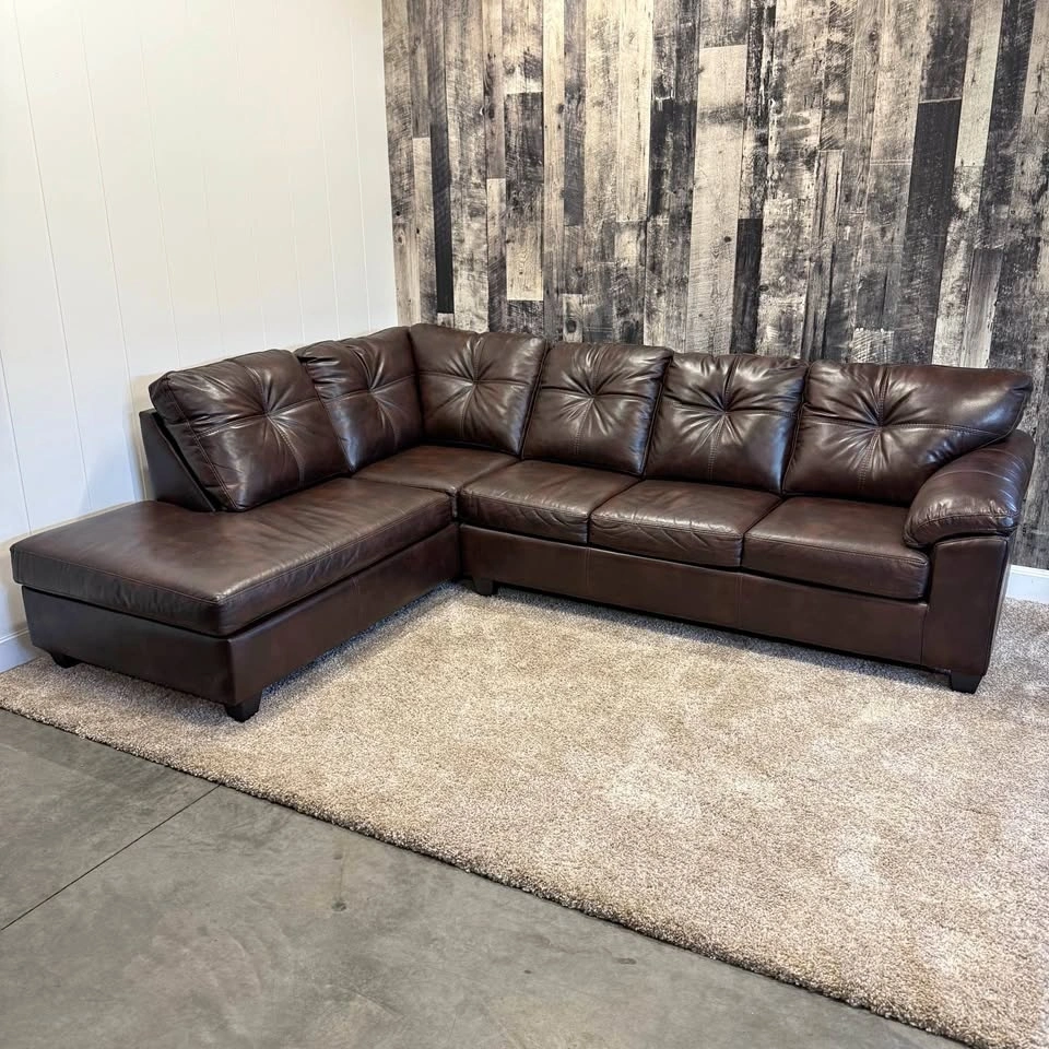 L-shaped sectional couch in rich brown faux leather. Tufted back cushions with a comfortable, supportive feel. Clean lines with low-profile legs. Solid frame with good structure throughout. Professionally cleaned and conditioned. From a non-smoking home — no stains, rips, or tears. Dimensions shown in the last photo. Check out my profile or join my group “That Couch Guy” for first access to new inventory.