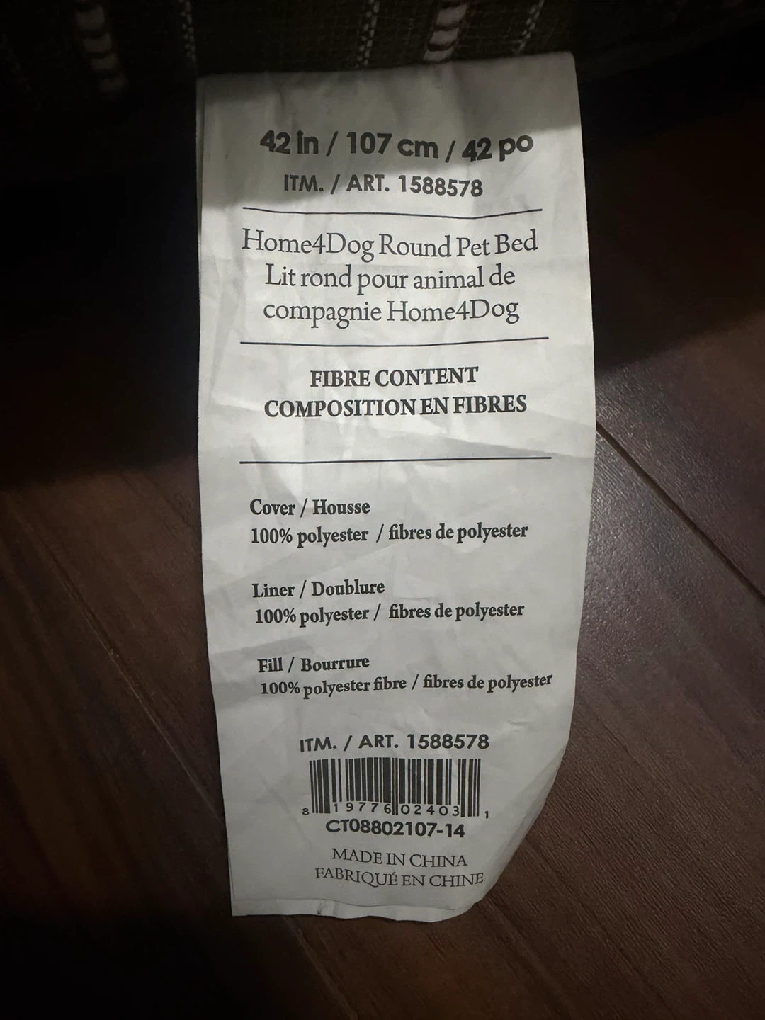 This is a Home4Dog round pet bed, measuring 42 inches in diameter. It's made with a 100% polyester cover and fill. This bed would be useful for a medium to large dog.