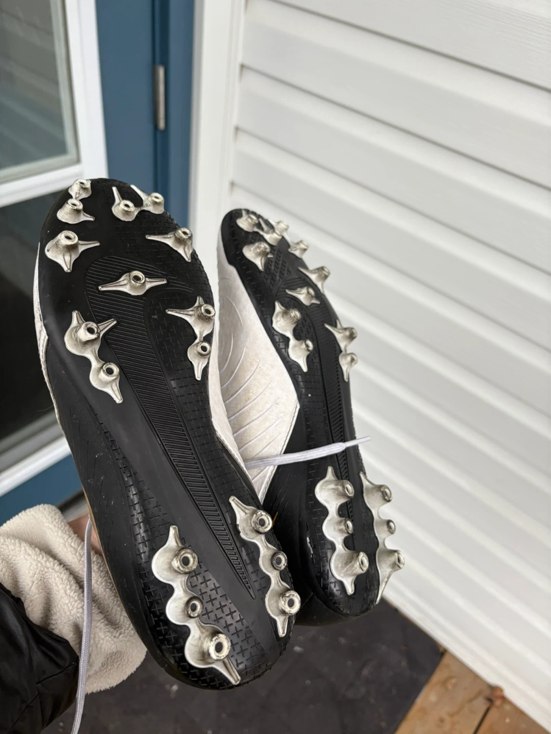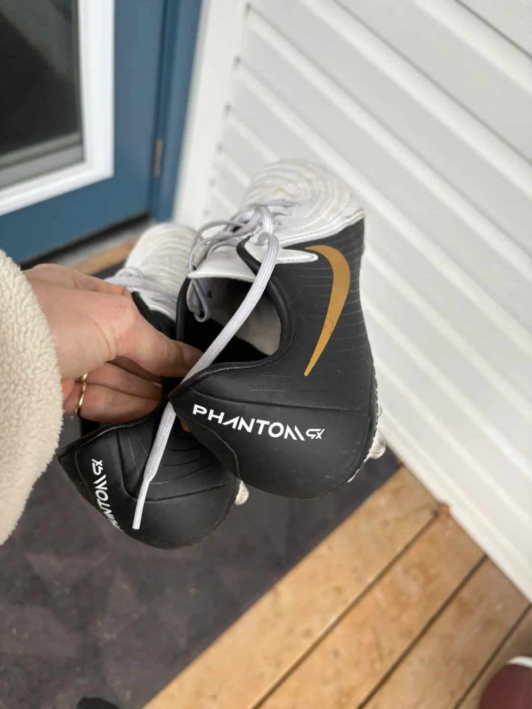 Nike Phantom GX soccer cleats in black and white with gold accents. Size US 8. Cleats are designed for firm ground play.