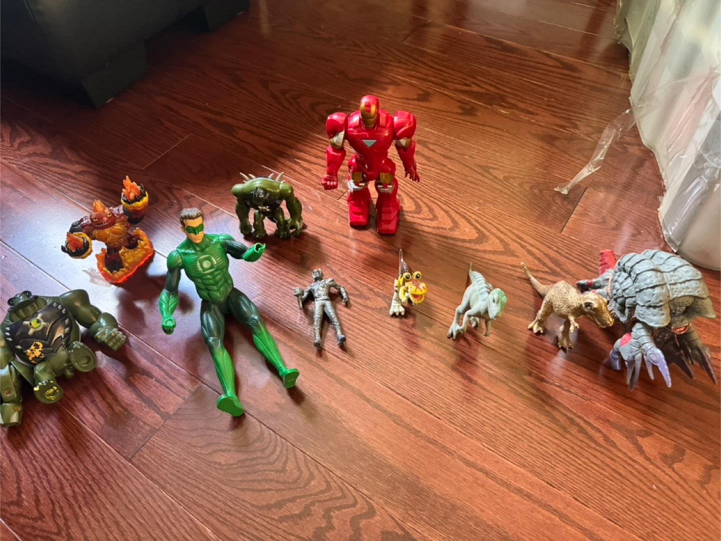 Selling a collection of assorted action figures. Includes characters like Green Lantern, Iron Man, and some cool dinosaur figures. Great for kids or collectors!