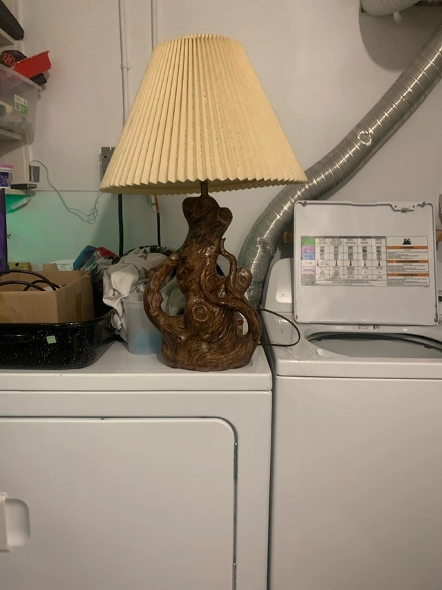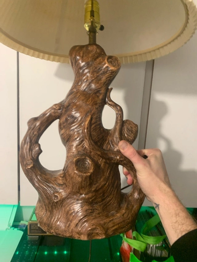 Add a touch of rustic charm to your home with this unique vintage table lamp. The lamp features a ceramic base crafted to resemble a tree trunk, complete with realistic wood grain and bark details. It's in good condition and provides a warm, ambient light, perfect for a living room or bedroom. The lamp comes with a beige pleated shade. Cash accepted.