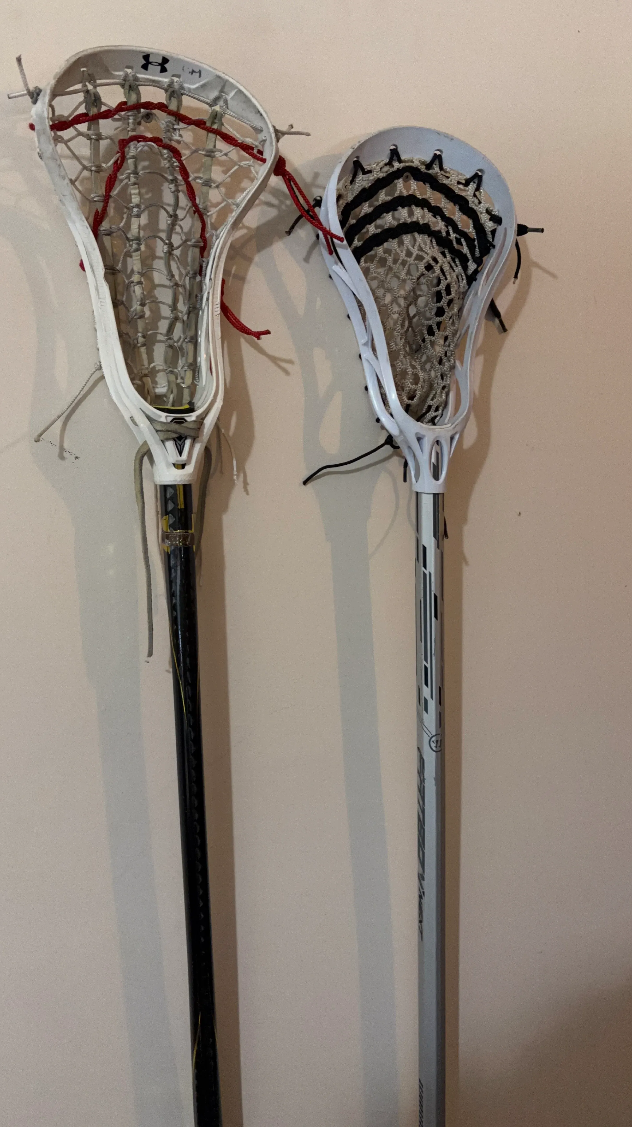 Two lacrosse sticks. One is white with red stringing and an Under Armour logo. The other is silver with black and tan stringing and a Warrior logo. Both sticks are in good condition.