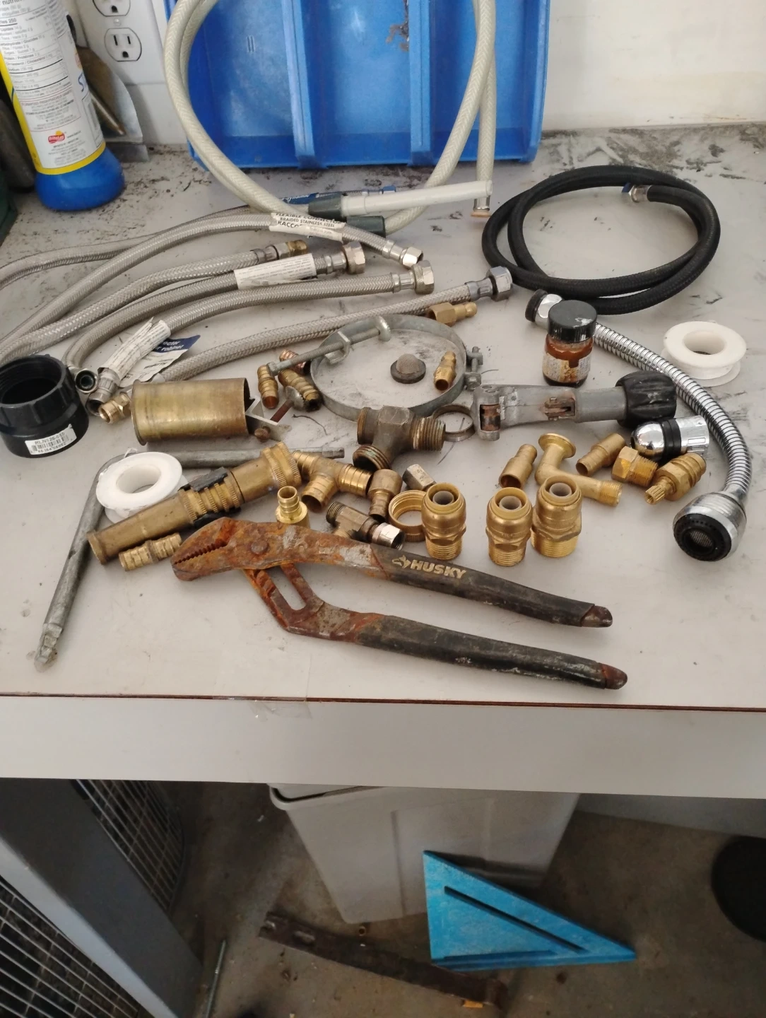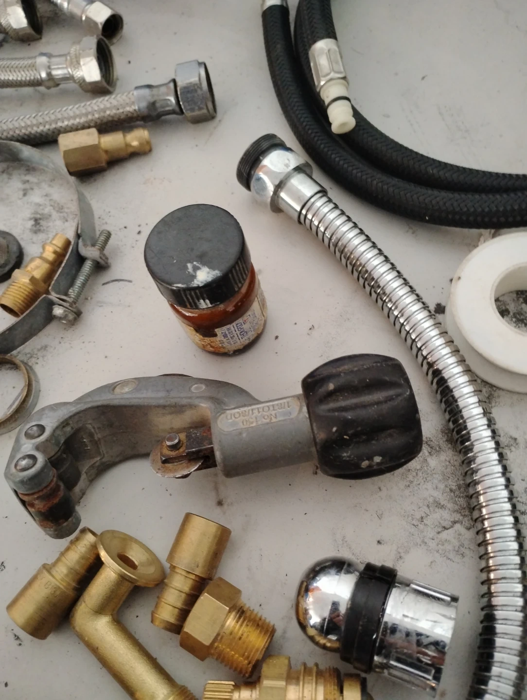 Includes various brass fittings, flexible hoses, a pipe cutter, and pliers. Most fittings appear to be for plumbing connections. Comes with Teflon tape and a handheld sprayer attachment.