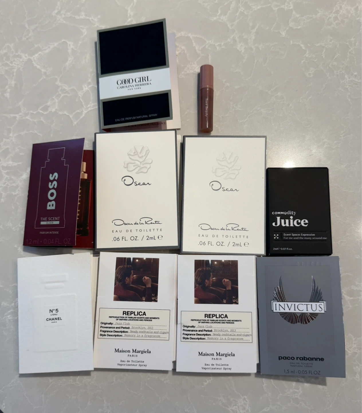 A collection of fragrance samples including Chanel N°5 L'Eau, Oscar de la Renta, Maison Margiela Replica, Commodity Juice, Rare Beauty, Paco Rabanne Invictus, Carolina Good Girl, BOSS The Scent Elixir,