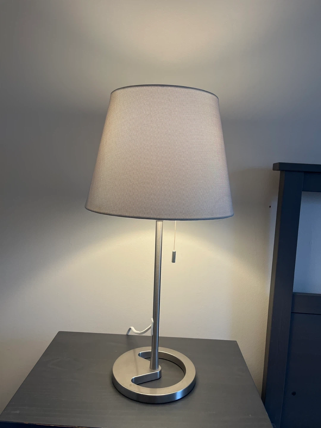 This is an IKEA NOT table lamp. It has a brushed metal finish and a gray fabric shade. The lamp is operated by a pull-chain switch. It's great for a bedside table or desk!