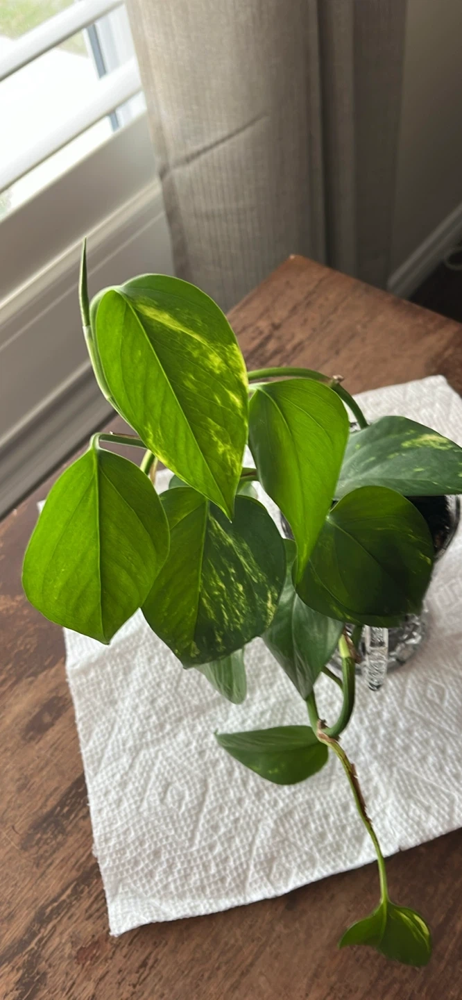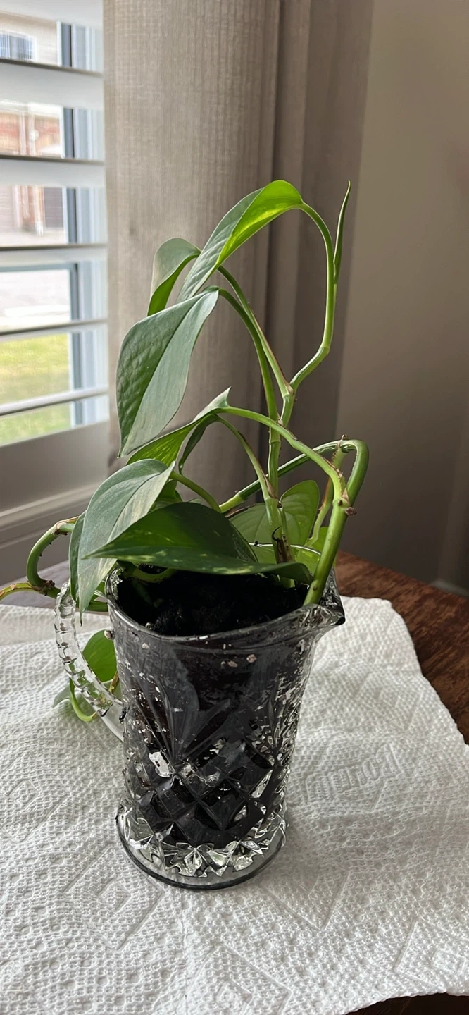 This is a Pothos plant, known for its easy care and attractive foliage. It's currently potted in a unique, textured glass holder (5 inches tall) that adds a decorative touch to any space. This plant would be a lovely addition to a home or office.