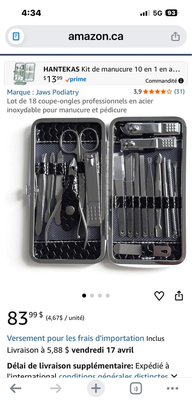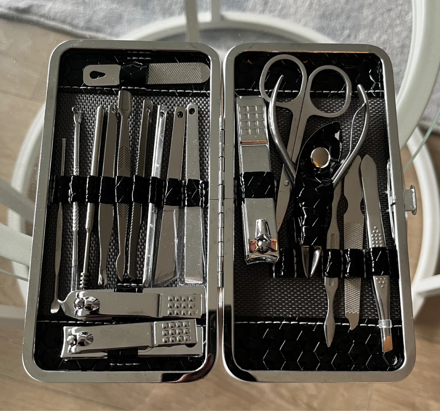 From USA 🇺🇸 A 18 piece stainless steel manicure and pedicure set. Comes in a sleek black case with a textured hexagonal pattern. Includes various tools for nail care.