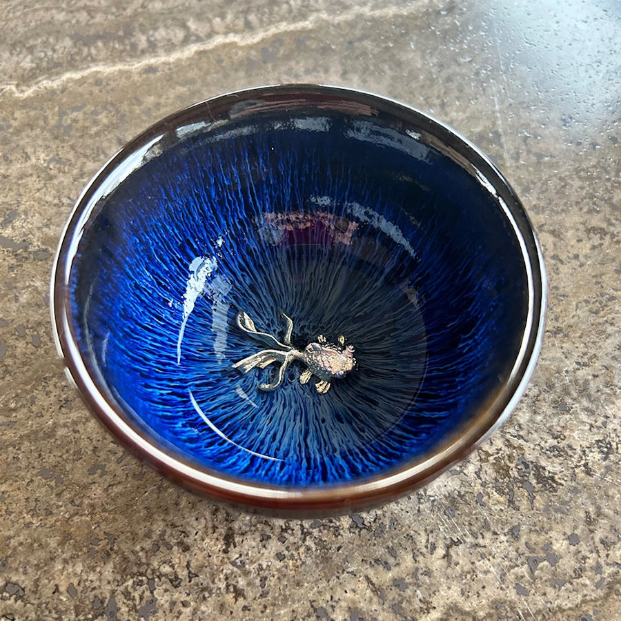 This Jianzhan Tenmoku Teacup from the Oil Spot style -- spot on -- is a typical Chinese gongfu style teacup. Inside is a silver carp, a magnificent decoration for the finest teas
