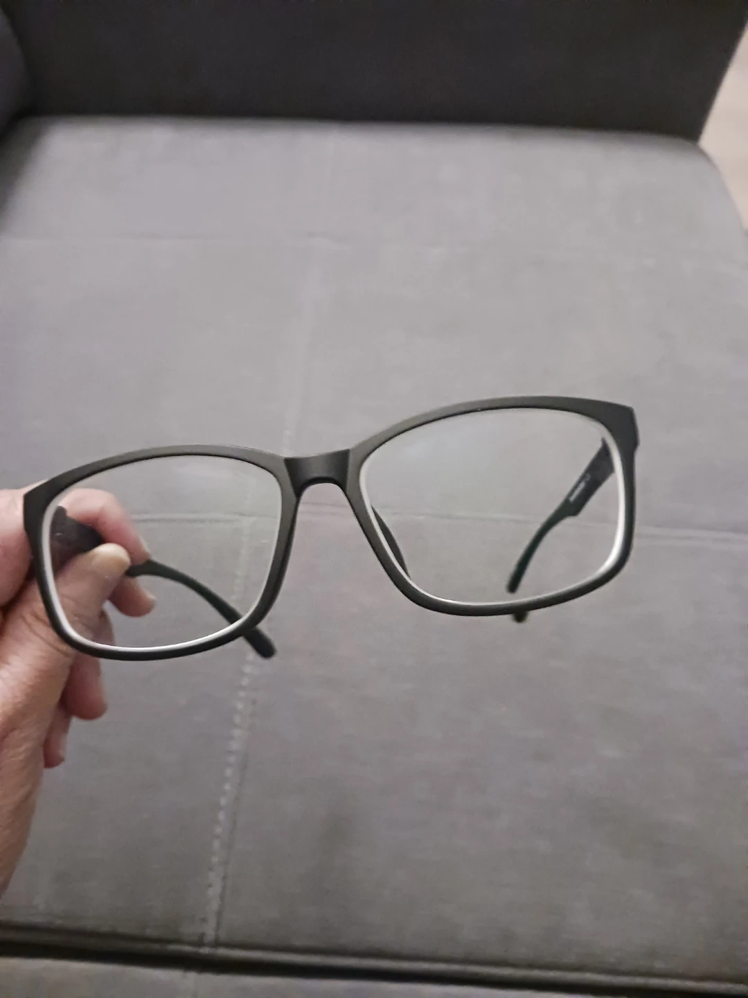 These eyeglasses feature a matte black frame with a silver accent around the lenses. They're designed for a modern look. Frame material is durable plastic.