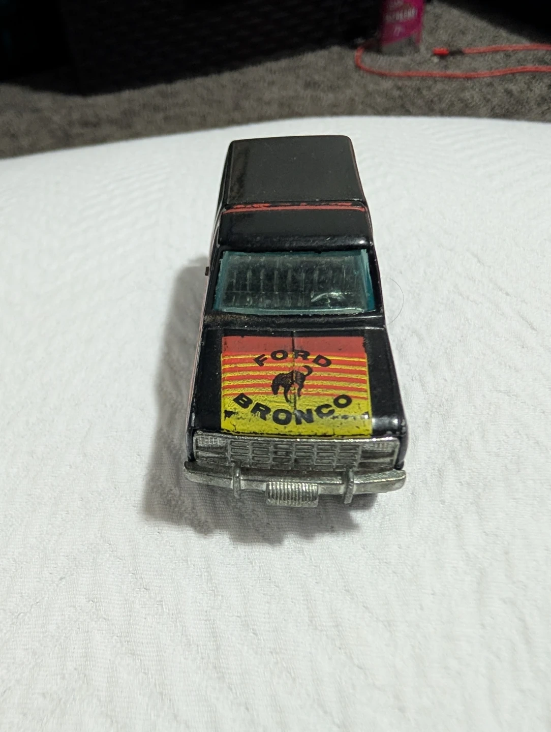 This is a vintage Ford Bronco toy truck. It's made of metal and features a black body with red accents. The front displays the Ford Bronco logo.