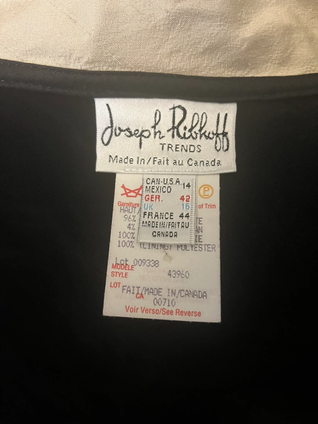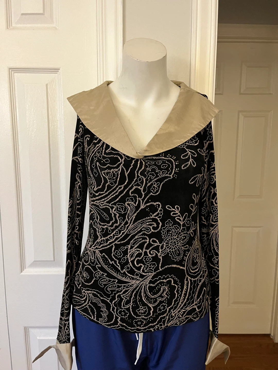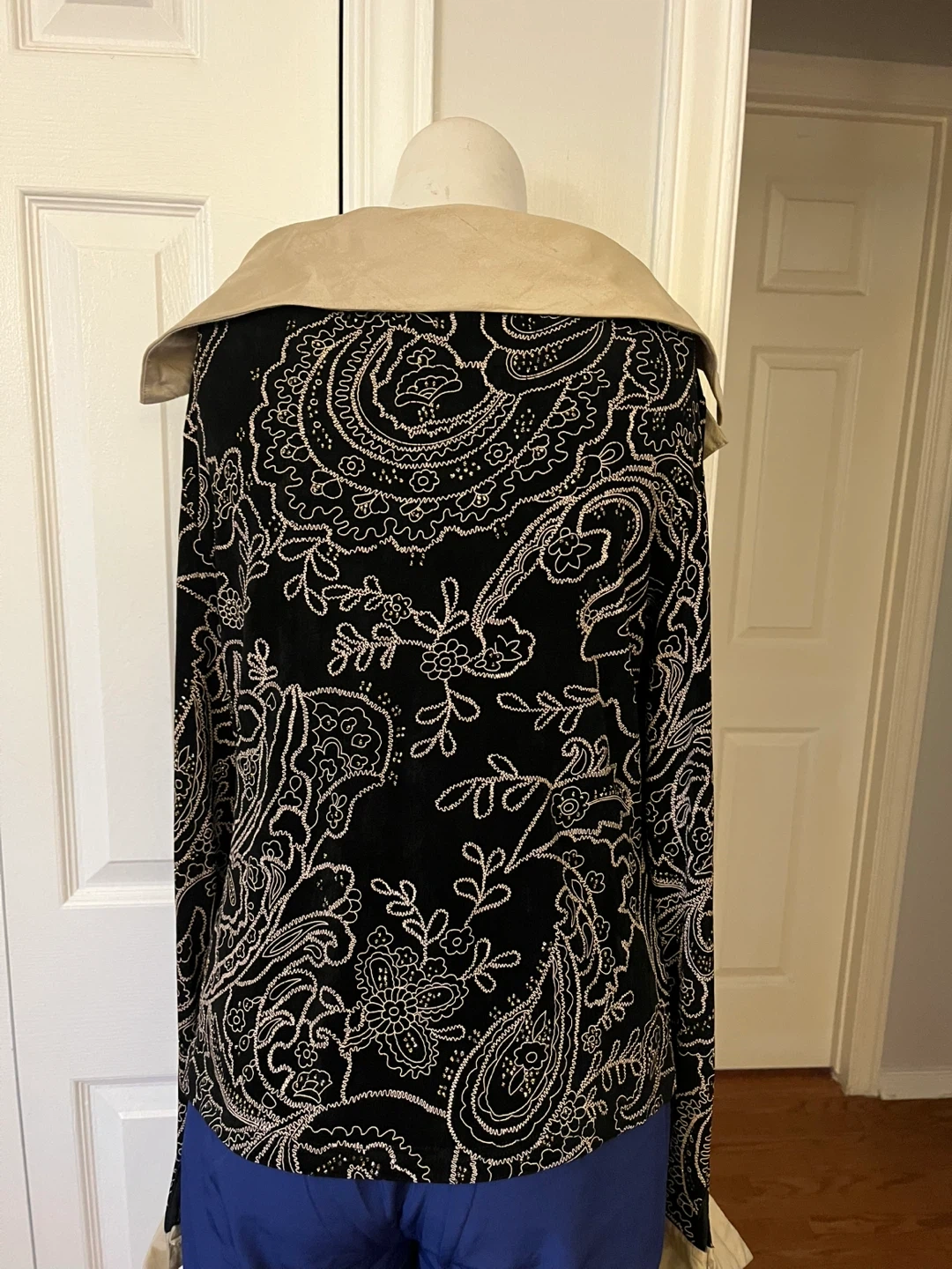 Joseph Ribkoff Trends long-sleeved top with a black and beige paisley print. Features a unique fold-over collar. Made in Canada. 96% polyester, 4% spandex. Lining is 100% polyester.