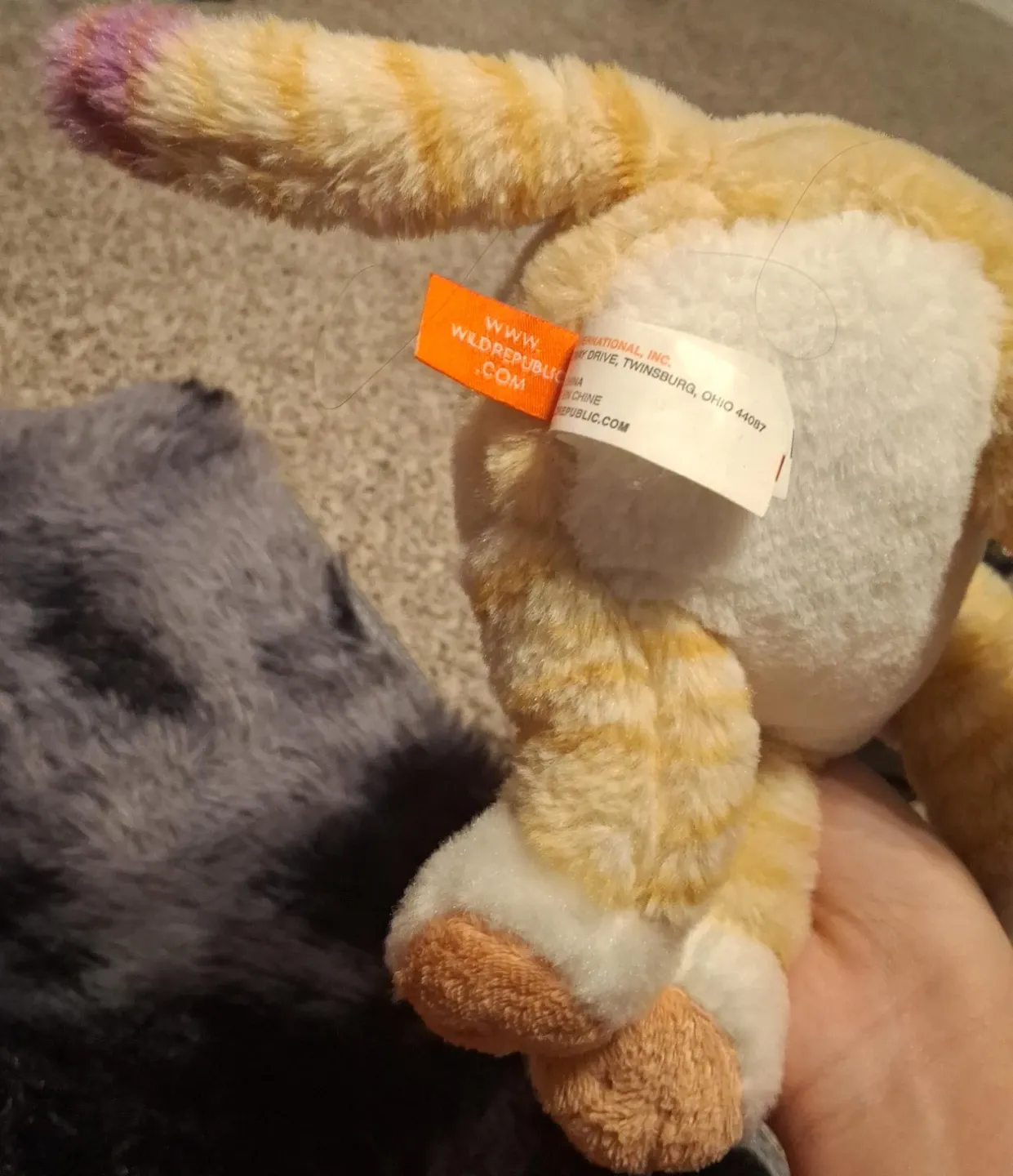 Orange and white striped plush cat toy. Made by Wild Republic International, Inc. Surface washable. It's a soft, cuddly stuffed animal.