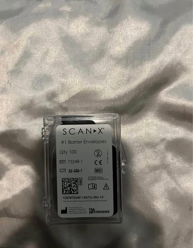 Box of SCANX #1 and #2 Barrier Envelopes. ScanX intraoral phosphor plates, sizes 1 and 2, complete with original box and included barriers. Ideal for radiography training in educational settings.