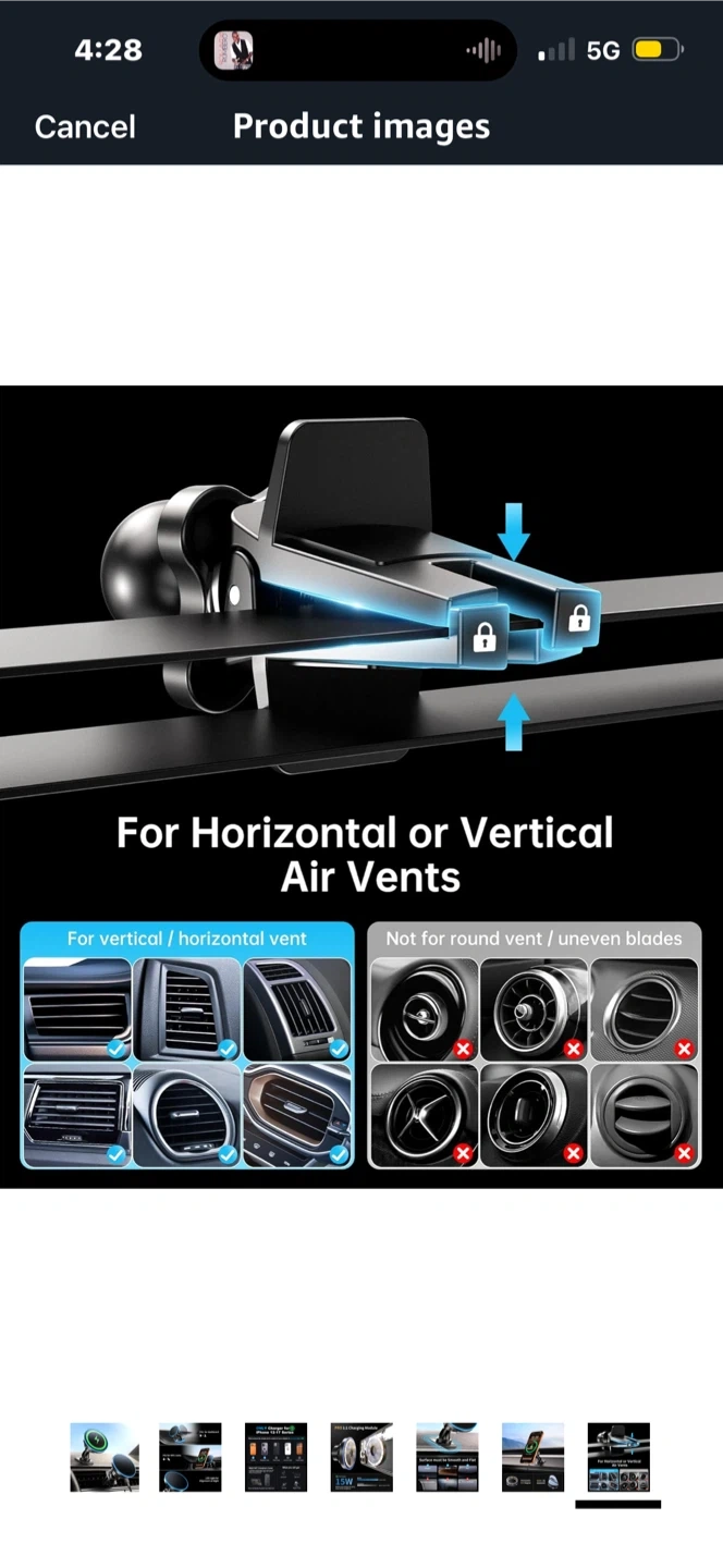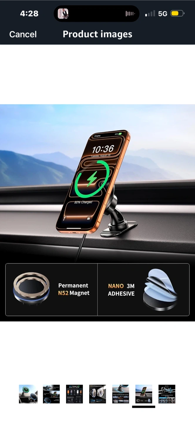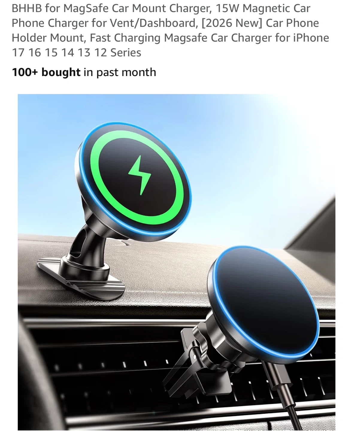 BHB MagSafe car mount charger with 15W fast charging capability. Includes dash mount, vent hook, and USB-A to C cable. Fits for dashboard or 99% of car vents.