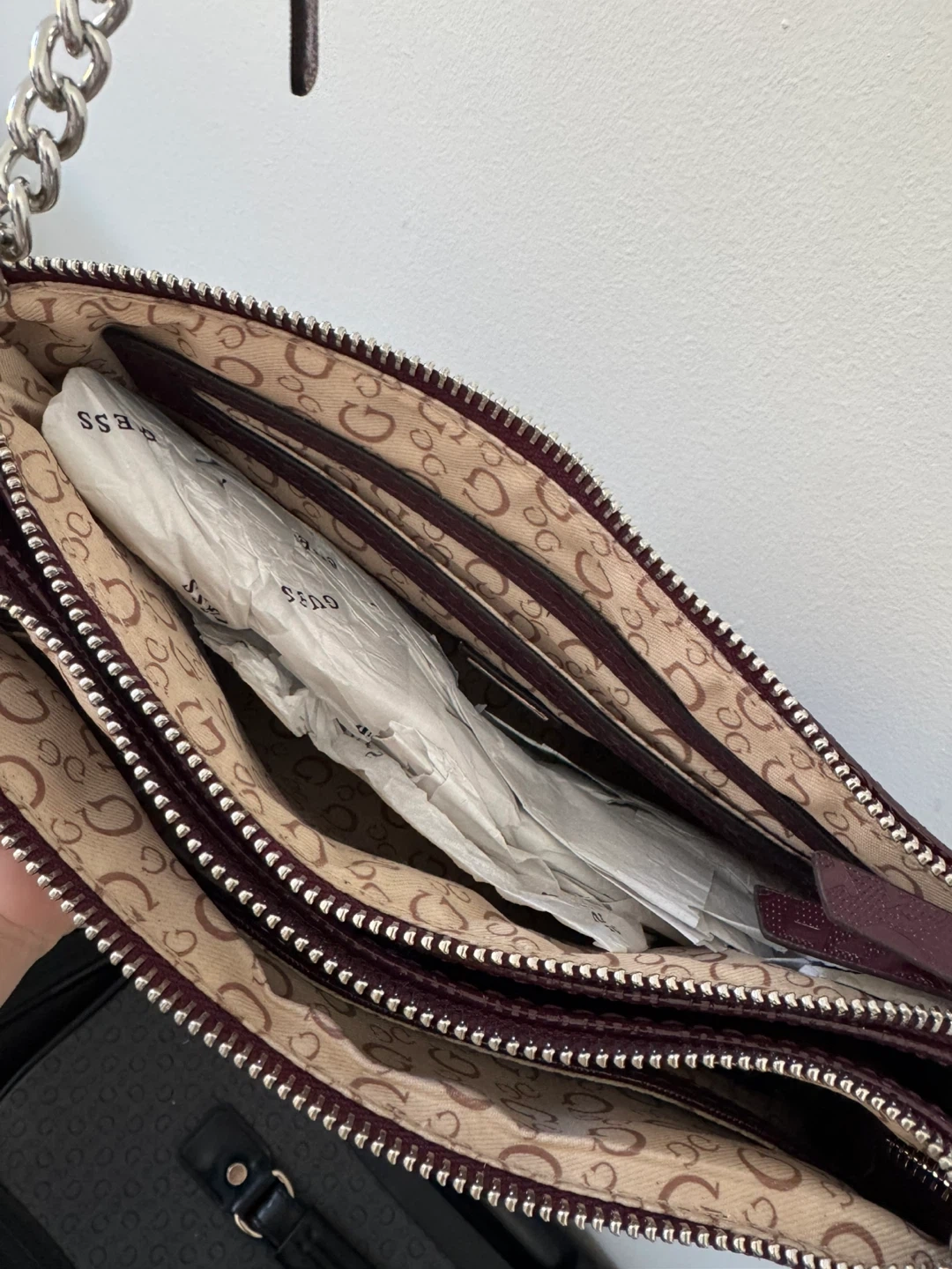 This Guess crossbody bag is a deep burgundy colour with an all-over embossed 'G' pattern. It has multiple zippered compartments inside and a silver-tone chain strap. It's a stylish and practical accessory for everyday use!