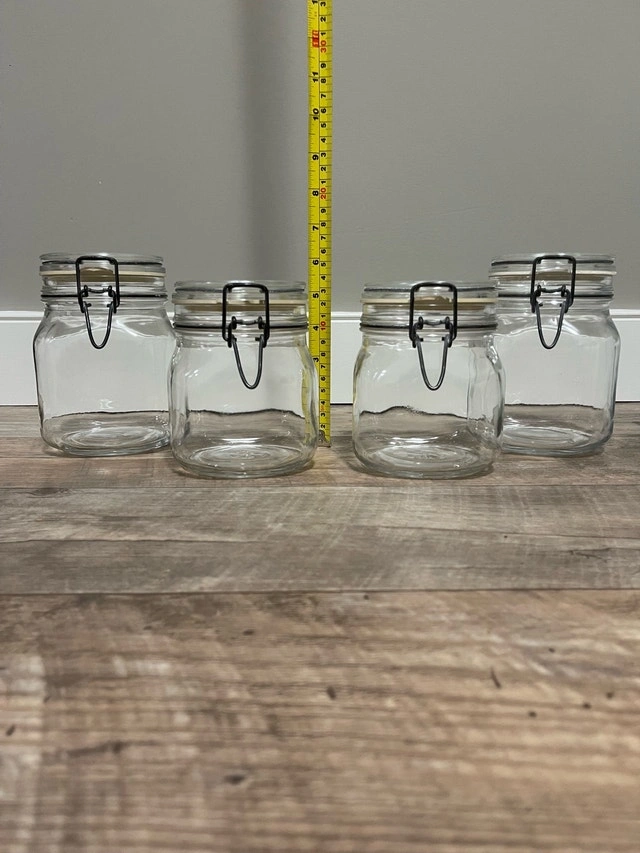 Add a touch of rustic charm to your kitchen with these four glass clip-top jars, two are 5.5” tall and two are 6.5” tall. Perfect for storing everything from pasta to homemade preserves, these jars are in good, used condition and ready for a new home. The durable clip-top closures ensure a tight seal, keeping your stored goods fresh. I think they're just the thing to keep your goods from going stale! If the ad is still up, the jars are still available! Cash accepted.